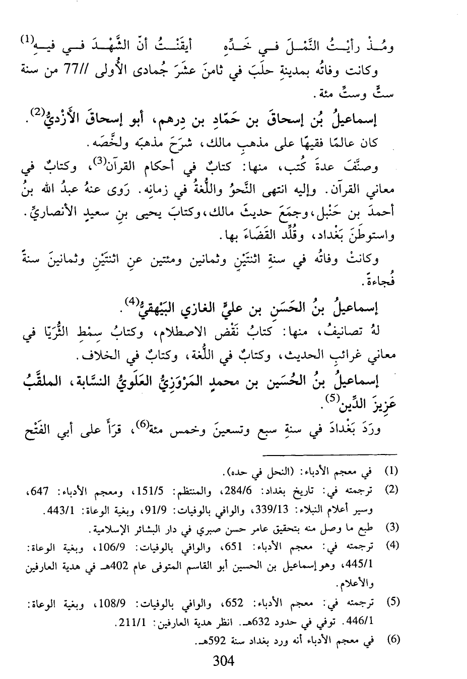 (¬4) ترجمته في: معجم الأدباء:651، والوافي بالوفيات:9/ 106، وبغية الوعاة: 1/ 445، وهو إسماعيل بن الحسين أبو القاسم المتوفى عام 402 هـ في هدية العارفين والأعلام.