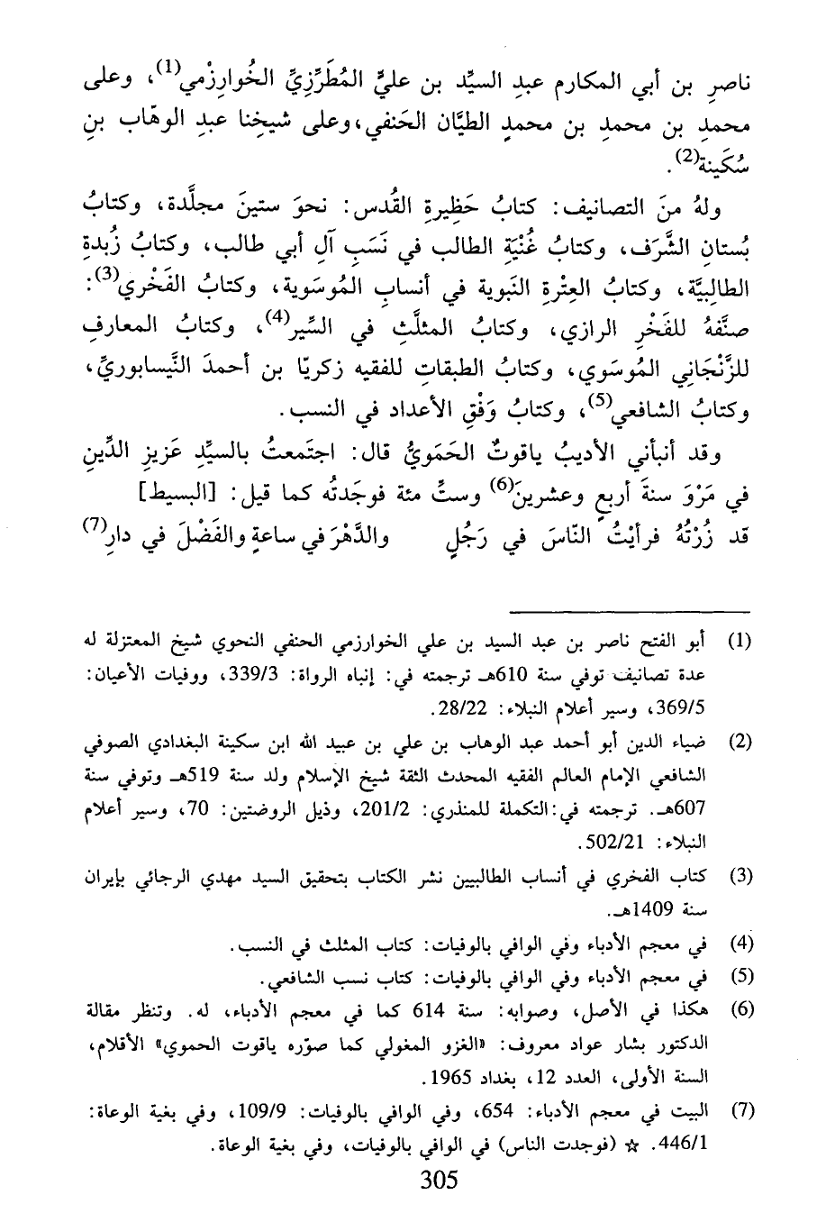 صنّفه للفخر الرازي، وكتاب المثلّث في السّير (¬4)، وكتاب المعارف للزّنجاني الموسوي، وكتاب الطبقات للفقيه زكريّا بن أحمد النّيسابوريّ، وكتاب الشافعي (¬5)، وكتاب وفق الأعداد في النسب.