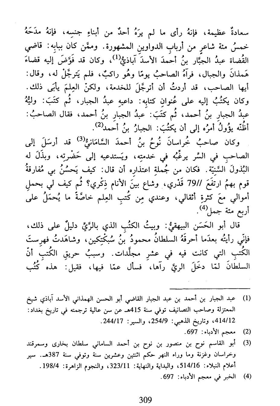 وكان صاحب خراسان نوح بن أحمد السّامانيّ (¬3) قد أرسل إلى الصاحب في السّر يرغّبه في خدمته، ويستدعيه إلى حضرته، وبذل له البذول السّنيّة. فكان من جملة اعتذاره أن قال: كيف يحسن بي مفارقة قوم بهم ارتفع/79/ قدري، وشاع بين الأنام ذكري؟ ثم كيف لي بحمل أموالي مع كثرة أثقالي، وعندي من كتب العلم خاصّة ما يحمل على أربع مائة جمل (¬4).