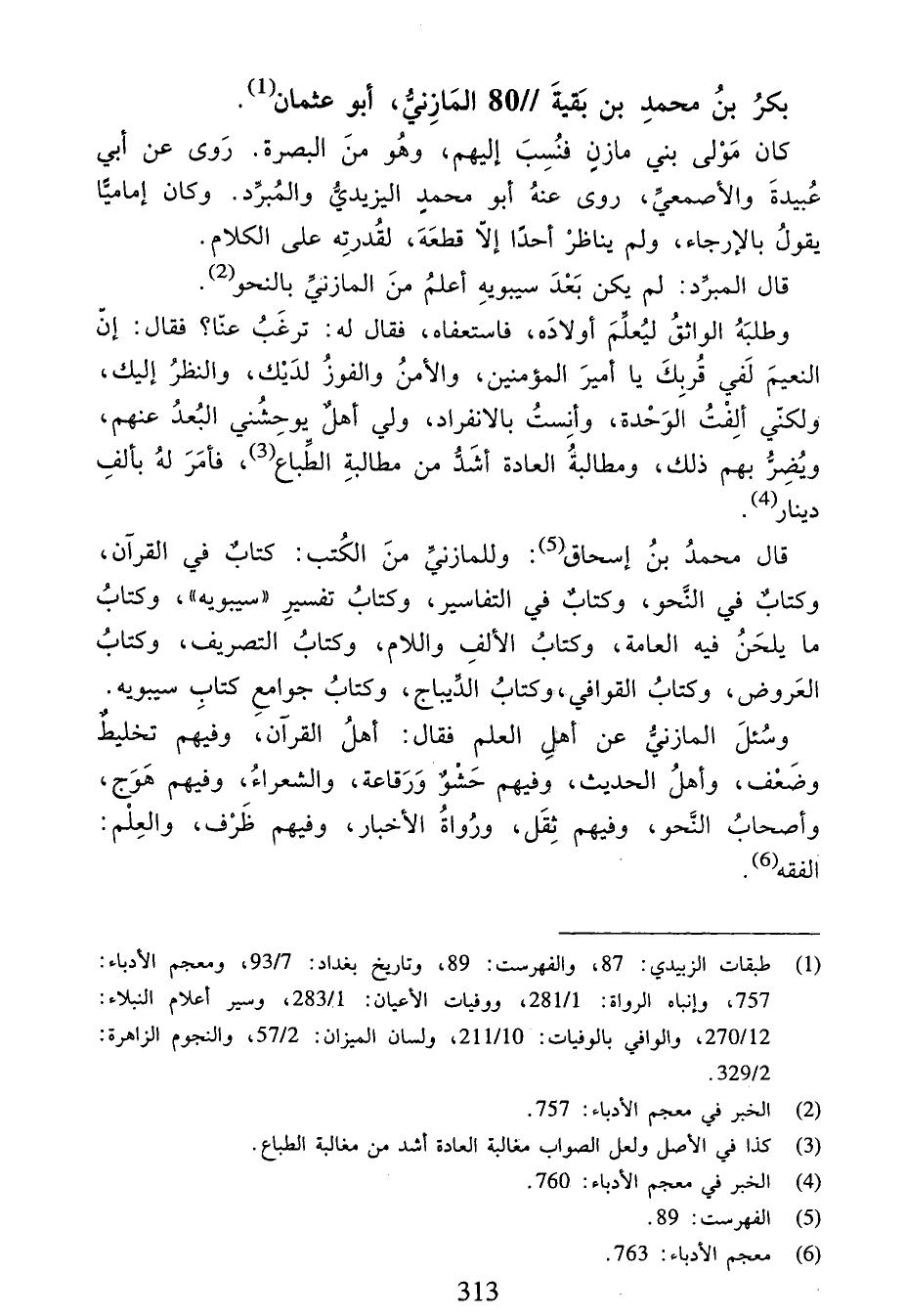 (¬1) طبقات الزبيدي:87، والفهرست:89، وتاريخ بغداد:7/ 93، ومعجم الأدباء: 757، وإنباه الرواة:1/ 281، ووفيات الأعيان:1/ 283، وسير أعلام النبلاء: 12/ 270، والوافي بالوفيات:10/ 211، ولسان الميزان:2/ 57، والنجوم الزاهرة: 2/ 329.