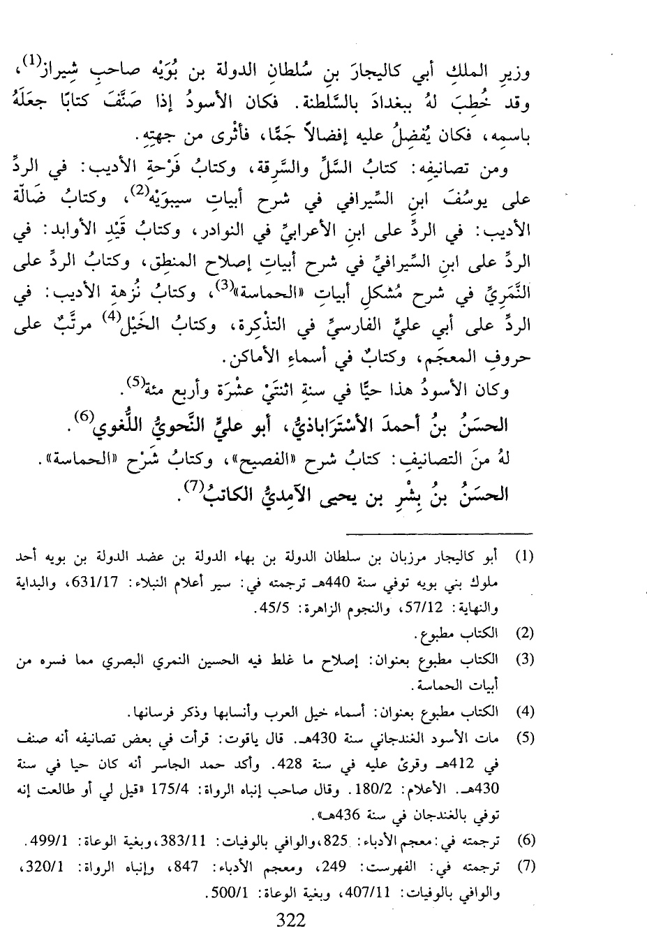 (¬5) مات الأسود الغندجاني سنة 430 هـ. قال ياقوت: قرأت في بعض تصانيفه أنه صنف في 412 هـ وقرئ عليه في سنة 428. وأكد حمد الجاسر أنه كان حيا في سنة 430 هـ. الأعلام:2/ 180. وقال صاحب إنباه الرواة:4/ 175 «قيل لي أو طالعت إنه توفي بالغندجان في سنة 436 هـ».