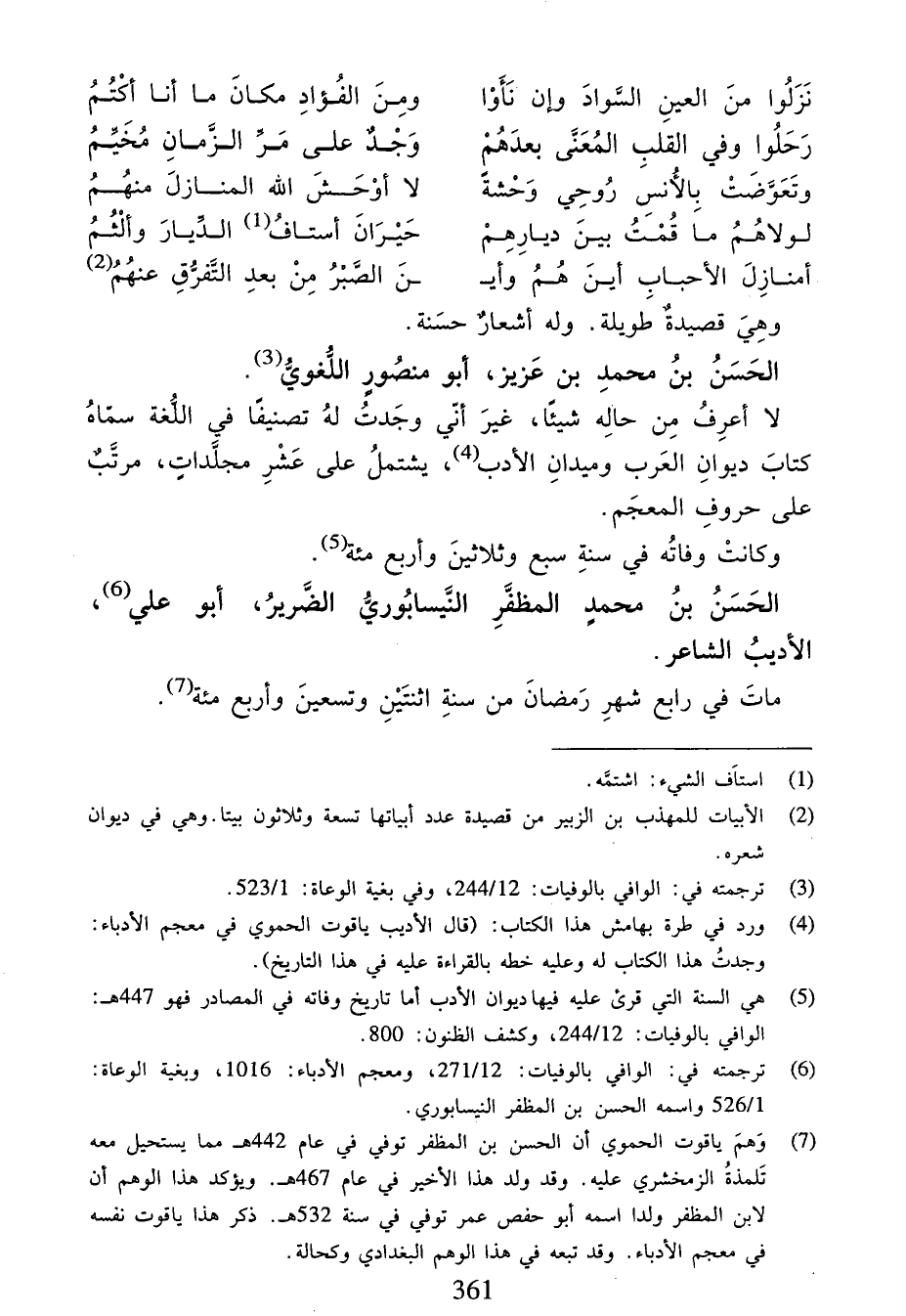 (¬6) ترجمته في: الوافي بالوفيات:12/ 271، ومعجم الأدباء:1016، وبغية الوعاة: 1/ 526 واسمه الحسن بن المظفر النيسابوري.