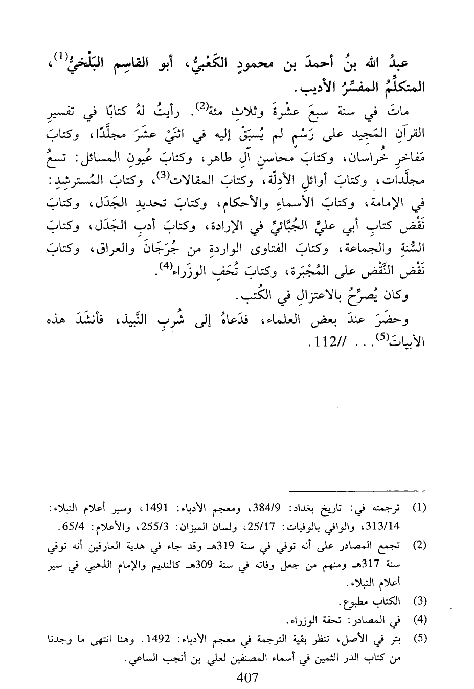 مات في سنة سبع عشرة وثلاث مائة (¬2). رأيت له كتابا في تفسير القرآن المجيد على رسم لم يسبق إليه في اثني عشر مجلّدا، وكتاب مفاخر خراسان، وكتاب محاسن آل طاهر، وكتاب عيون المسائل: تسع مجلّدات، وكتاب أوائل الأدلّة، وكتاب المقالات (¬3)، وكتاب المسترشد: