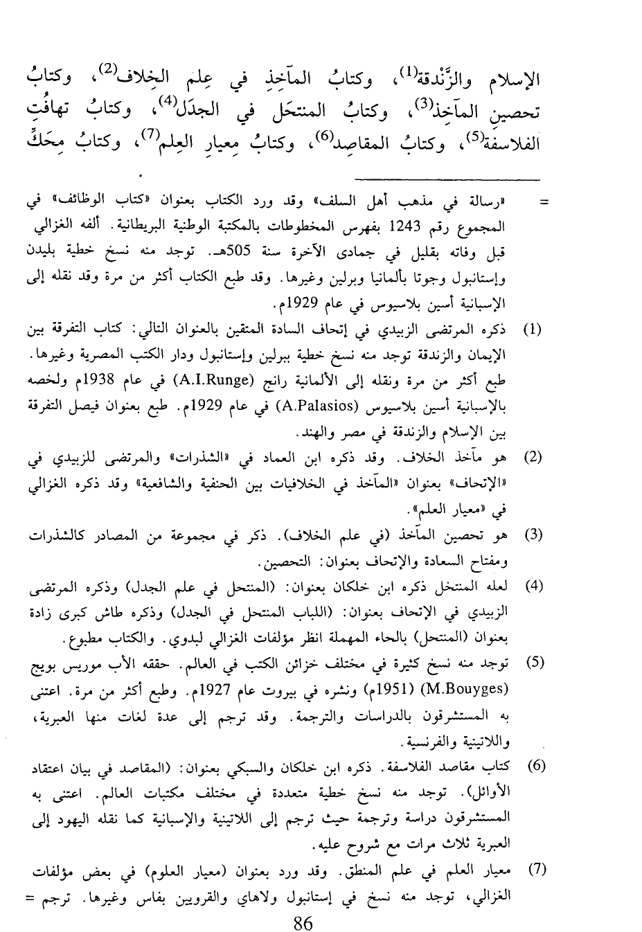 (¬1) ذكره المرتضى الزبيدي في إتحاف السادة المتقين بالعنوان التالي: كتاب التفرقة بين الإيمان والزندقة توجد منه نسخ خطية ببرلين وإستانبول ودار الكتب المصرية وغيرها. طبع أكثر من مرة ونقله إلى الألمانية رانج (A .I .Runge) في عام 1938 م ولخصه بالإسبانية أسين بلاسيوس (A .Palasios) في عام 1929 م. طبع بعنوان فيصل التفرقة بين الإسلام والزندقة في مصر والهند.