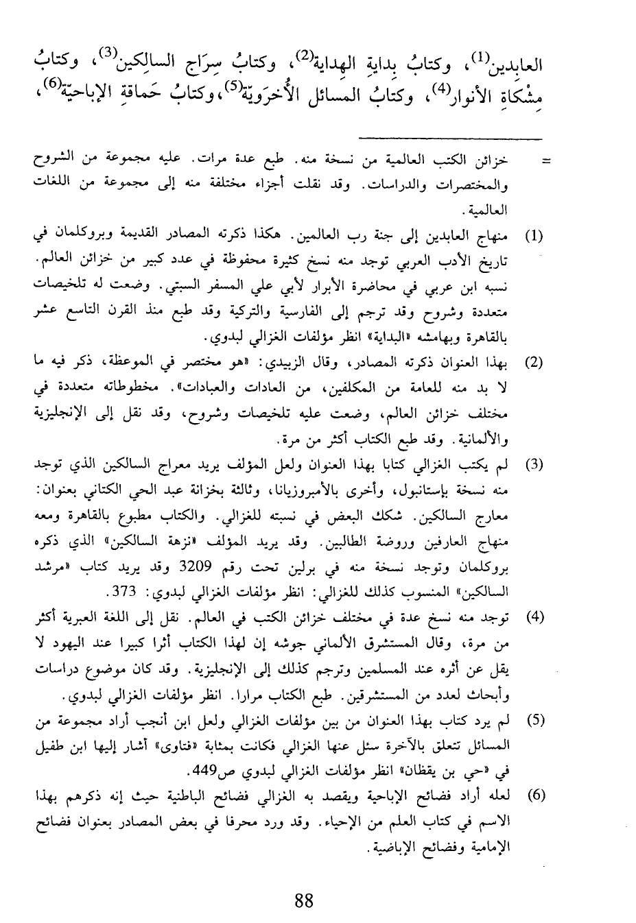 (¬3) لم يكتب الغزالي كتابا بهذا العنوان ولعل المؤلف يريد معراج السالكين الذي توجد منه نسخة بإستانبول، وأخرى بالأمبروزيانا، وثالثة بخزانة عبد الحي الكتاني بعنوان: معارج السالكين. شكك البعض في نسبته للغزالي. والكتاب مطبوع بالقاهرة ومعه منهاج العارفين وروضة الطالبين. وقد يريد المؤلف «نزهة السالكين» الذي ذكره بروكلمان وتوجد نسخة منه في برلين تحت رقم 3209 وقد يريد كتاب «مرشد السالكين» المنسوب كذلك للغزالي: انظر مؤلفات الغزالي لبدوي:373.