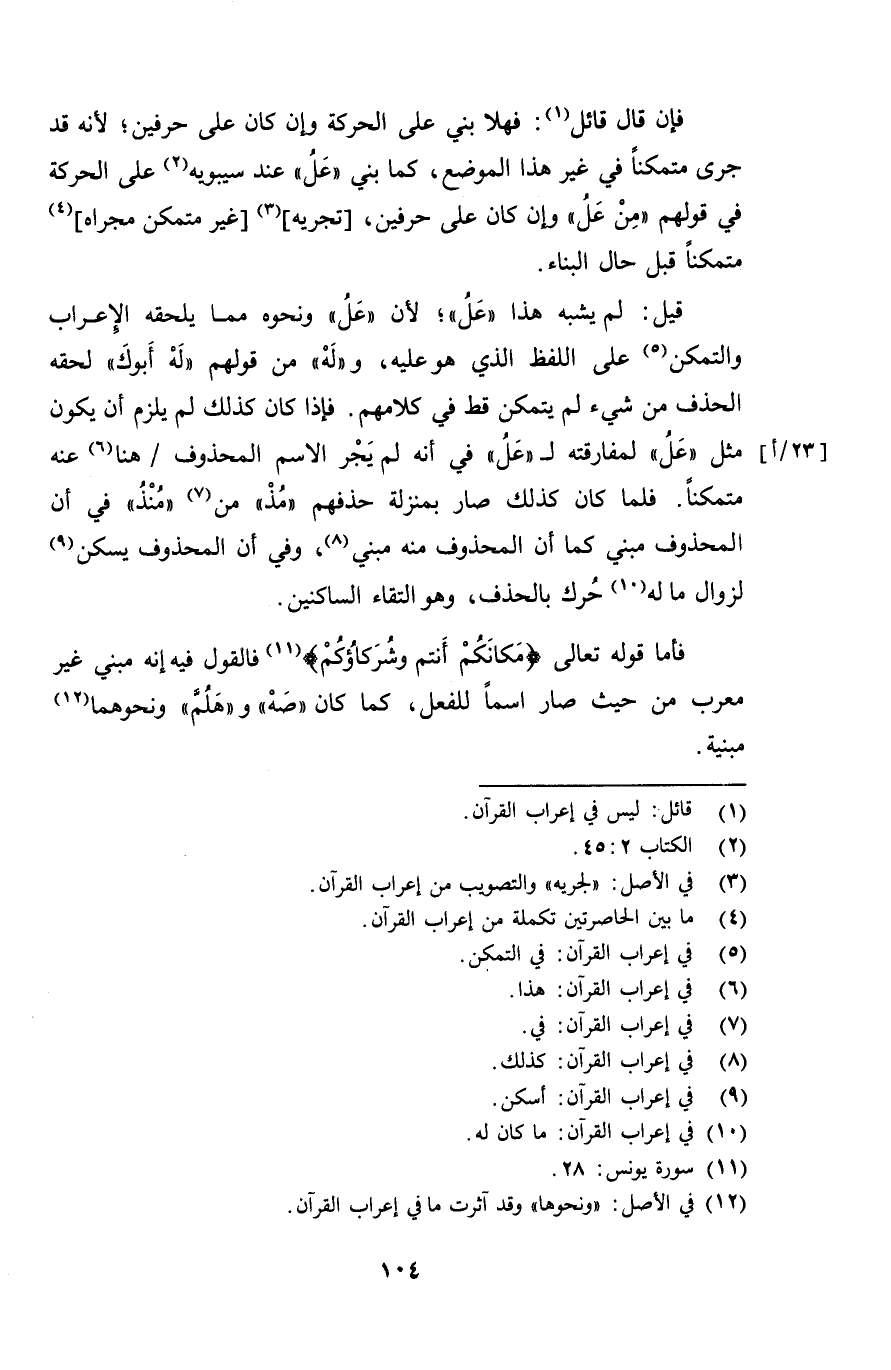 فأما قوله تعالى {مكانكم أنتم وشركاؤكم} فالقول فيه إنه مبني غير معرب من حيث صار اسماً للفعل، كما كان "صه" و "هلم" ونحوهما مبنية.