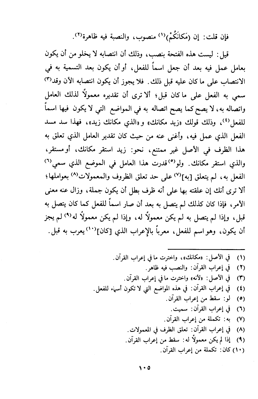 فإن قلت: إن (مكانكم) منصوب، والنصبة فيه ظاهرة.