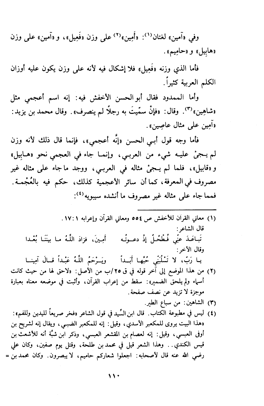 وأما الممدود فقال أبو الحسن الأخفش فيه: إنه اسم أعجمي مثل "شاهين". وقال: "فإن سميت به رجلاً لم ينصرف". وقال محمد بن يزيد: "آمين على مثال عاصين".