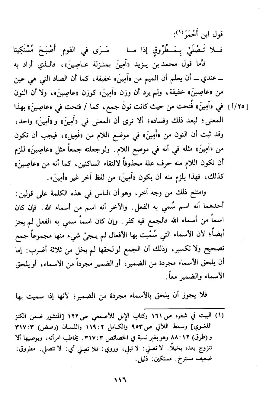 فأما قول محمد بن يزيد "آمين بمنزلة عاصين"، فالذي اراد به - عندي - أن يعلم أن الميم من "آمين" خفيفة، كما أن الصادق التي هي عين من "عاصين" خفيفة، ولم يرد أن وزن "آمين" كوزن "عاصين"، ولا أن النون في "آمين" فتحت من حيث كانت نون جمع، كما فتحت في "عاصين" بهذا المعنى؛ لبعد ذلك وفساده؛ ألا ترى أن المعنى في "أمين" و "آمين" واحد، وقد ثبت أن النون من "أمين" في موضع اللام من "فعيل"، فيجب أن تكون من "آمين" مثله في أنه في موضع اللام. ولو جعلته جمعاً مثل "عاصين" للزم أن تكون اللام منه حرف علة محذوفاً لالتقاء الساكنين، كما أنه من "عاصين" كذلك، فهذا يلزم منه أن يكون "آمين" من لفظ آخر غير "آمين".