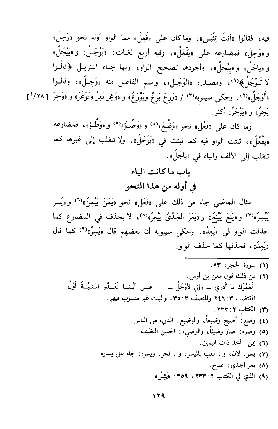 فيه، فقالوا "أنت تئبى"، وما كان على "فَعِل" مما الواو أوله نحو "وَجِل" و"وَحِل" فمضارعه على "يفعل"، وفيه أربع لغات: "يوجل" و "ييجل" و"ياجل" و"ييجل"، وأجودها تصحيح الواو، وبها جاء التنزيل {قالوا لا توجل"، ومصدره "الوجل"، واسم الفاعل منه "وجل"، وقالوا "أوجل". وحكى سيبويه "ورع يرع ويورع" و "وغر يغر يوغر" ووحر يحر" و "يوحر" أكثر.