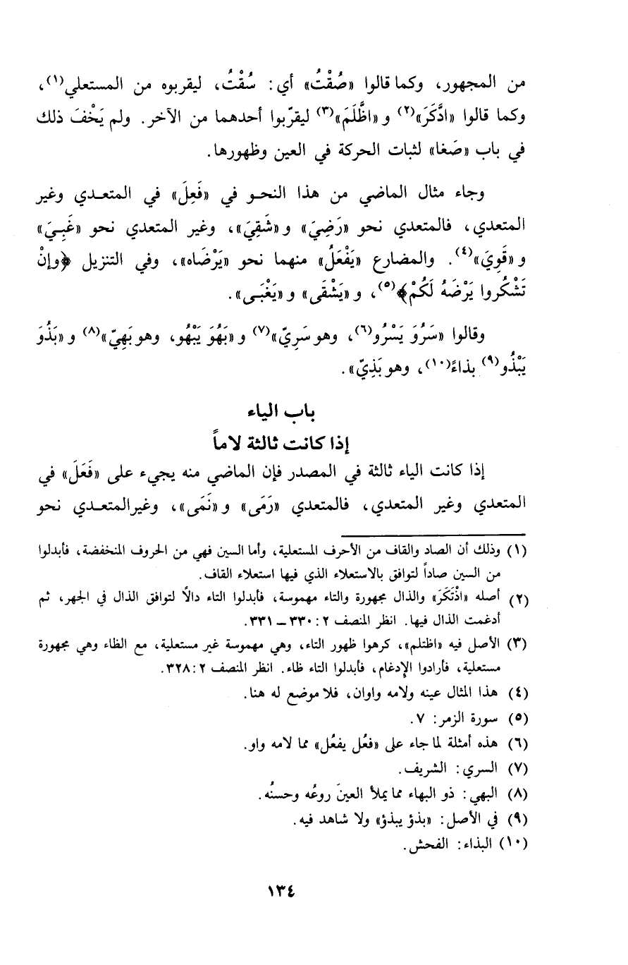 وجاء مثال الماضي من هذا الناحو في "فعِل" في المتعدي وغير المتعدي، فالمتعدي نحو "رضِي" و"شقي"، وغير المتعدي نحو "غبي" و"قوي". والمضارع "يفعل" منهما نحو "يرضاه"، وفي التنزيل {وإن تشكروا يرضه لكم}، و"يشقى" و"يغبى".
