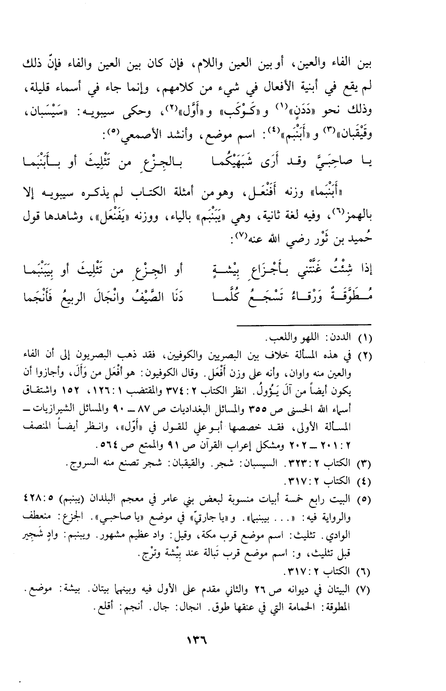 "أبنبما" وزنه أفنعل، وهو من أمثلة الكتاب لم يذكره سيبويه إلا بالهمز، وفيه لغة ثانية، وهي "يبنبم"بالياء، ووزنه "يفنعل"، وشاهدها قول حميد بن ثور رضي الله عنه:
