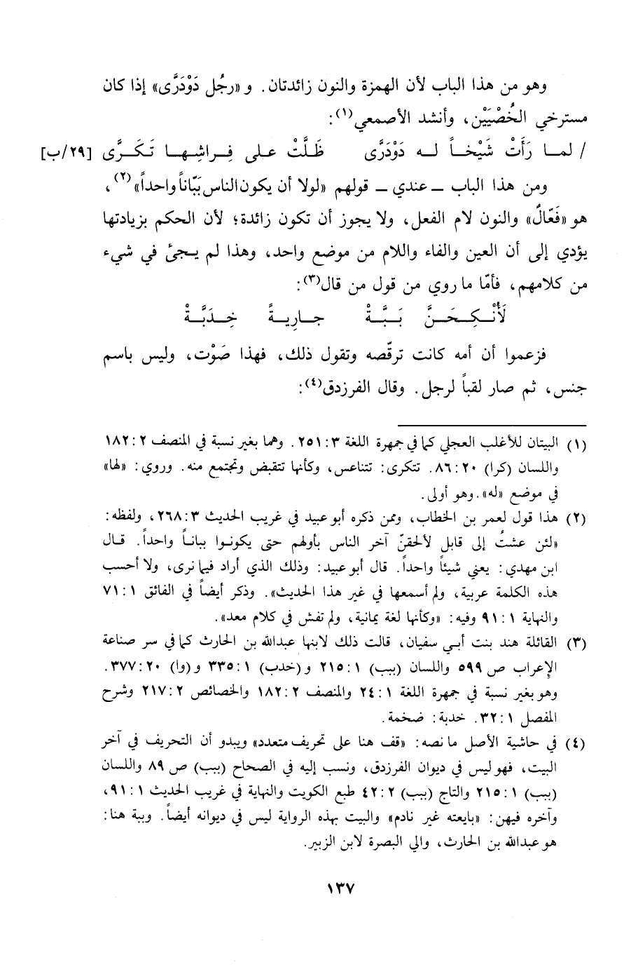ومن هذا الباب - عندي - قولهم "لولا أن يكون الناس بباناً واحداً"، هو "فعالٌ" والنون لام الفعل، ولا يجوز أن تكون زائدة؛ لأن الحكم بزيادتها يؤدي إلى أن العين والفاء واللام من موضع واحد، وهذا لم يجئ في شيء من كلامهم، فأما ما روي من قول من قال: