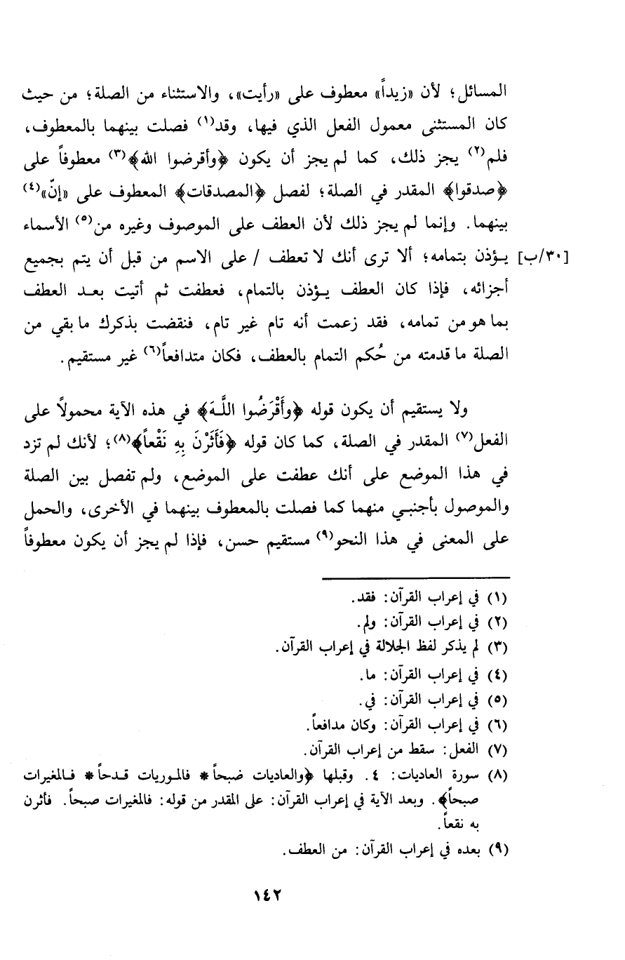 المسائل؛ لأن "زيداً" معطوف على "رأيت"، والاستثناء من الصلة؛ من حيث كان المستثنى معمول الفعل الذي فيها، وقد فصلت بينهما بالمعطوف، فلم يجز ذلك، كما لم يجز أن يكون {وأقرضوا الله} معطوفاً على {صدقوا} المقدر في الصلة؛ لفصل {المصدقات} المعطوف على "إن" بينهما. وإنما لم يجز ذلك لأن العطف على الموضوع وغيره من الأسماء يؤذن بتمامه؛ ألا ترى أنك لا تعطف على الاسم من قبل أن يتم بجميع أجزائه، فغذا كان العطف يؤذن بالتمام، فالعطف ثم أتيت بعد العطف بما هو من تمامه، فقد زعمت أنه تام غير تام، فنقضت بذكرك ما بقي من الصلة ما قدمته من حكم التمام بالعطف، فكان متدافعاً غير مستقيم.