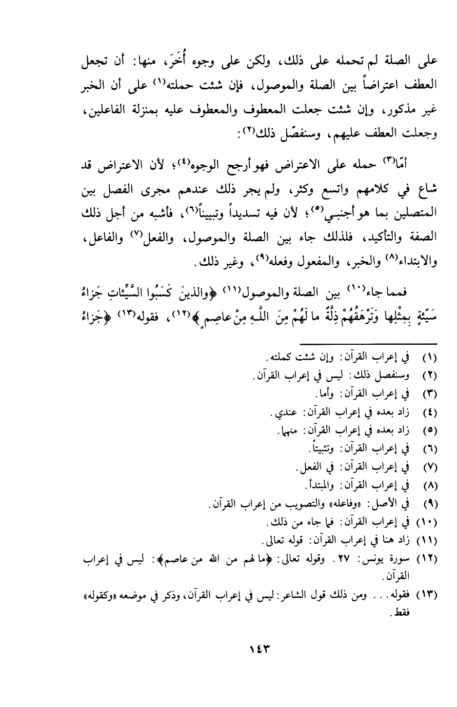أما حملة على الاعتراض فهو أرجح الوجوه؛ لأن الاعتراض قد شاع في كلامهم واتسع وكثر، ولم يجر ذلك عندهم مجرى الفصل بين المتصلين بما هو أجنبي؛ لأن فيه تسديداً وتبييناً، فأشبه من أجل ذلك الصفة والتأكيد، فلذلك جاء بين الصلة والموصول، والفعل والفاعل، والابتداء والخبر، والمفعول وفعله، وغير ذلك.