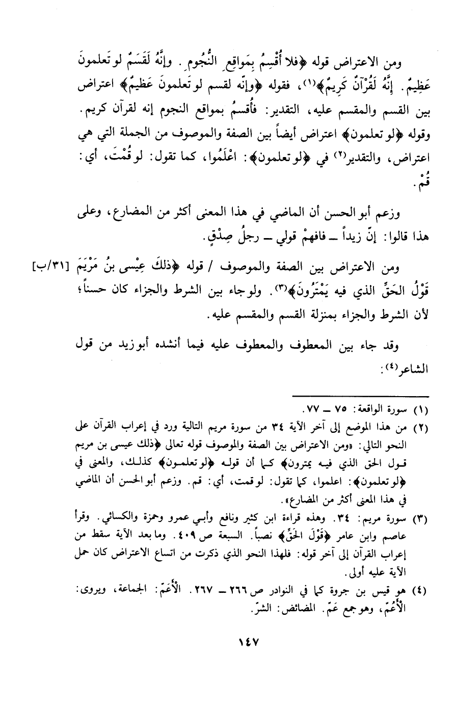 ومن الاعتراض قوله {فلا أقسم بمواقع النجوم. وإنه لقسم لو تعلمون عظيم. إنه لقرآن كريمٌ}، فقوله {وإنه لقسم لو تعلمون عظيمٌ} اعتراض بين القسم والمقسم عليه، التقدير: فأقسم بمواقع النجوم إنه لقرآن كريم. وقوله {لو تعلمون} اعتراض أيضاً بين الصفة والموصوف من الجملة التي هي اعتراض، والتقدير في {لو تعلمون}: اعلموا، كما تقول: لو قمت، أي: قم.
