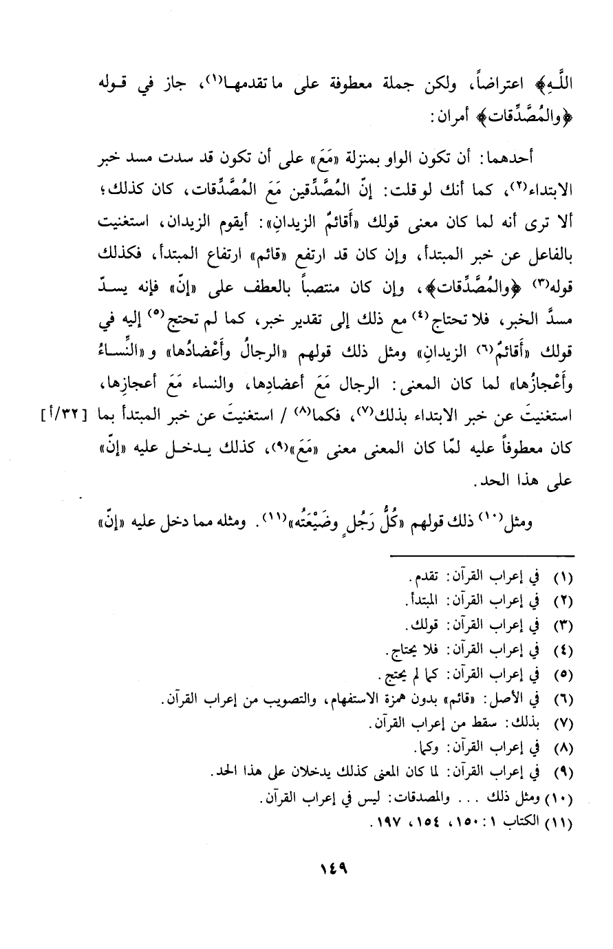 أحدهما: أن تكون الواو بمنزلة "مع" على أن تكون قد سدت مسد خبر الابتداء، كما أنك لو قلت: إن المصَّدقين مع المصدقات، كان كذلك؛ الا ترى أنه لما كان معنى قولك "أقائمٌ الزيدان": أيقوم الزيدان، استغنيت بالفاعل عن خبر المبتدأ، وإن كان قد ارتفع "قائم" ارتفاع المبتدأ، فكذلك قوله {والمصدقات}، وإن كان منتصباً بالعطف على "إن" فإنه يسد مسد الخبر، فلا تحتاج مع ذلك إلى تقدير خبر، كما لم تحتج إليه في قولك "أقائمٌ الزيدان" ومثل ذلك قولهم "الرجال وأعضادها" و "النساء وأعجازها" لما كان المعنى: الرجال مع أعضادها، والنساء مع أعجازها، استغنيت عن خبر الابتداء بذلك، فكما استغنيت عن خبر المبتدأ بما كان معطوفاً عليه لما كان المعنى معنى "مع"، كذلك يدخل عليه "إن" على هذا الحد.