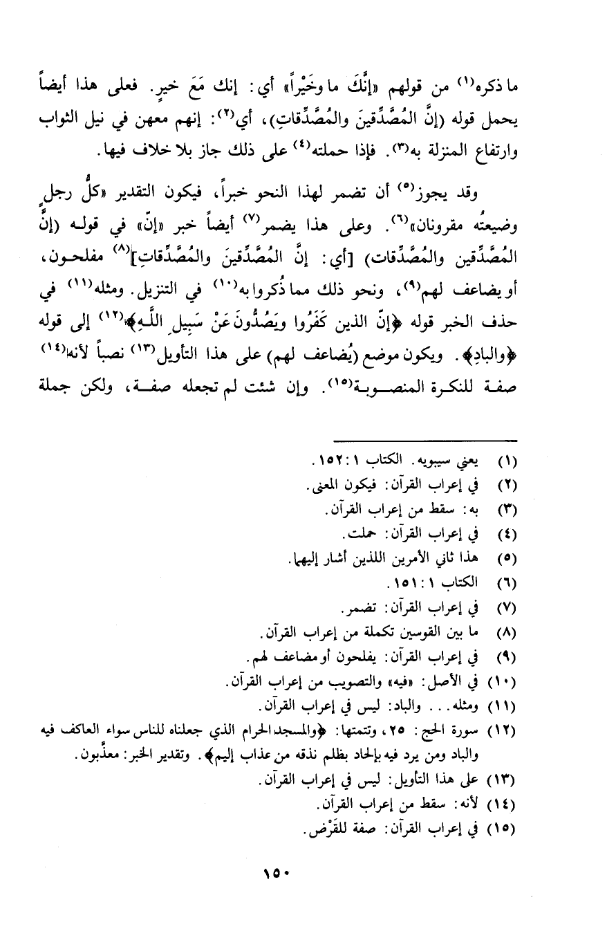 وقد يجوز أن تضمر لهذا النحو خبراً، فيكون التقدير "كل رجلٍ وضيعته مقرونان". وعلى هذا يضمر أيضاً خبر "إن" في قوله (إن المصدقين والمصدقات) [أي: إن المصدقين والمصدقات] مفلحون، أو يضاعف لهم، ونحو ذلك مما ذكروا به في التنزيل. ومثله في حذف الخبر قوله {إن الذين كفروا ويصدون عن سبيل الله} إلى قوله {والباد}. ويكون موضع (يضاعف لهم) على هذا التأويل نصباً لأنه صفة للنكرة المنصوبة. وإن شئت لم تجعله صفة، ولكن جملة
