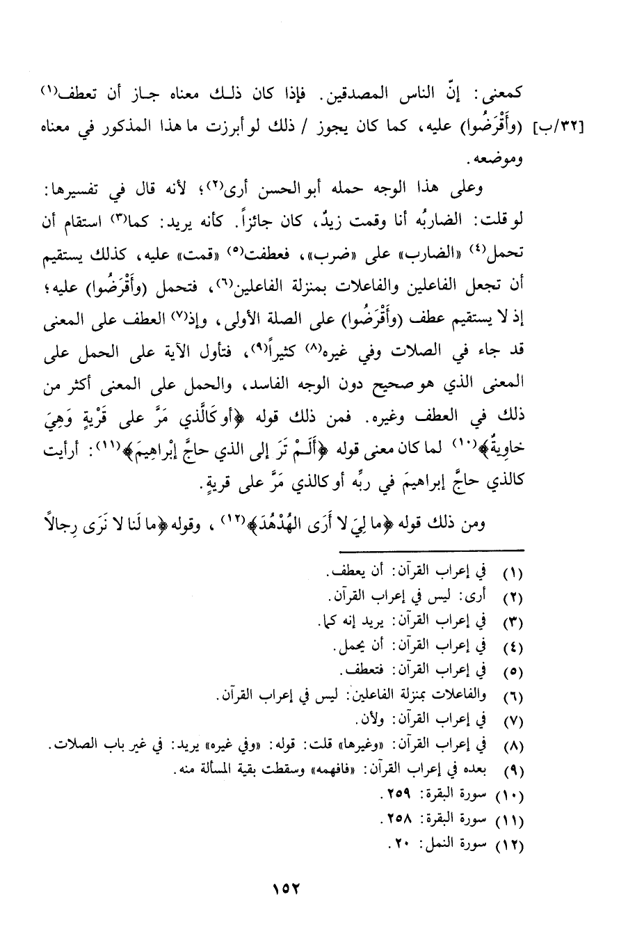 وعلى هذا الوجه حمله أبو الحسن أرى؛ لأنه قال في تفسيرها: لو قلت: الضاربة أنا وقمت زيدٌ، كان جائزاً. كأنه يريد: كما استقام أن تحمل "الضارب" على "ضرب"، فعطفت "قمت" عليه، كذلك يستقيم أن تجعل الفاعلين والفاعلان بمنزلة الفاعلين، فتحمل (وأقرضوا) عليه؛ إذ لا يستقم عطف (وأقرضوا) على الصلة الأولى، وإذ العطف على المعنى قد جاء في الصلاة وفي غيره كثيراً، فتأول الآية على الحمل على المعنى الذي هو صحيح دون الوجه الفاسد، والحمل على المعنى أكثر من ذلك في العطف وغيره. فمن ذلك قوله {أو كالذي مر على قريةٍ وهي خاويةٌ} لما كان معنى قوله {ألم تر إلى الذي حاجَّ إبراهيم}: أرأيت كالذي حاج إبراهيم في ربه أو كالذي مر على قريةٍ.