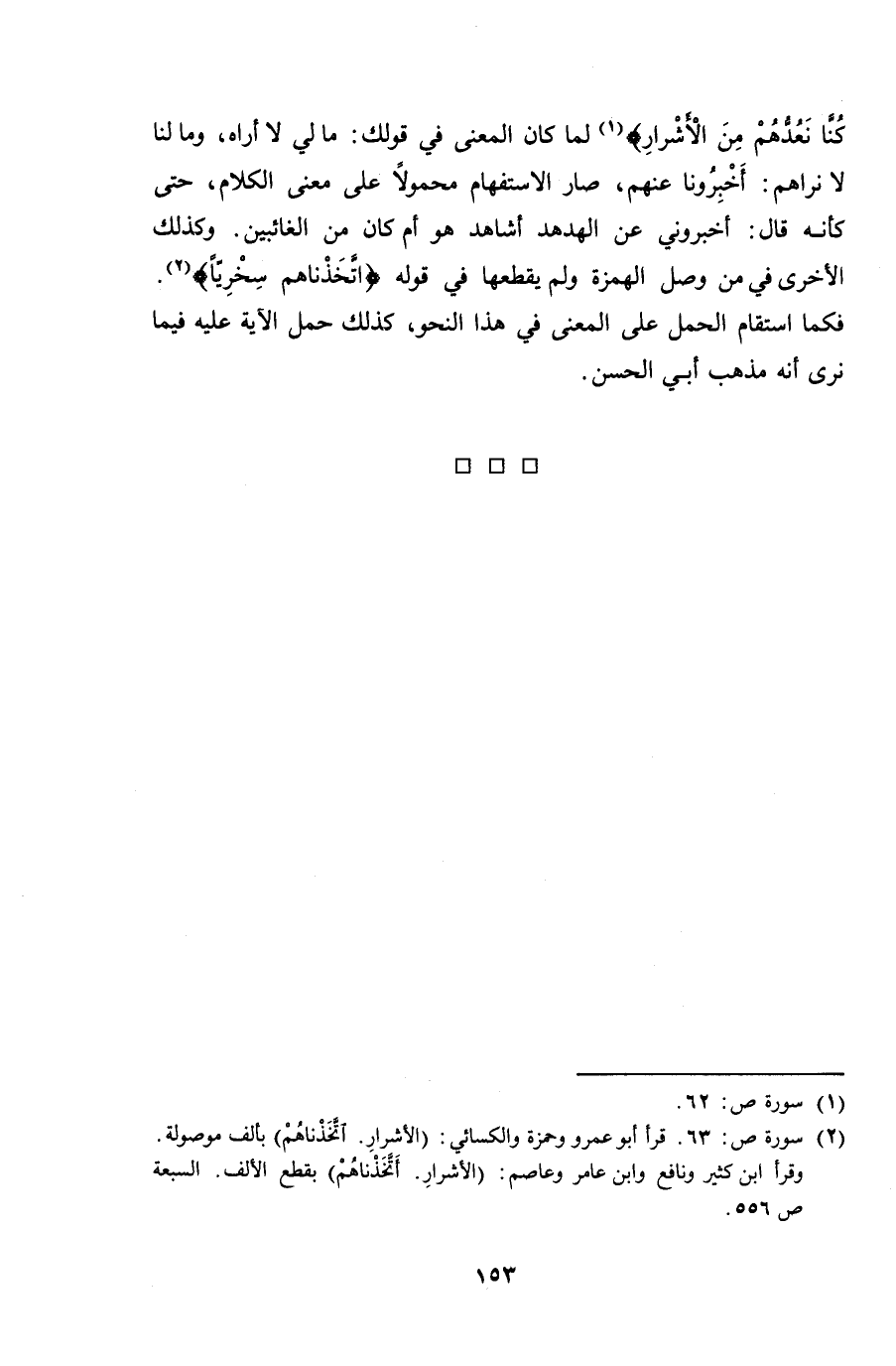 كنا نعدهم من الأشرار} لما كان المعنى في قولك: ما لي لا أراه، وما لنا لا نراهم: أخبرونا عنهم، صار الاستفهام محمولاً على معنى الكلام، حتى كأنه قال: أخبروني عن الهدهد أشاهد هو أم كان من الغائبين. وكذلك الأخرى في من وصل الهمزة ولم يقطعها في قوله {اتخذناهم سخرياً}. فكما استقام الحمل على المعنى في هذا النحو، كذلك حمل الآية عليه فيما نرى أنه مذهب أبي الحسن.