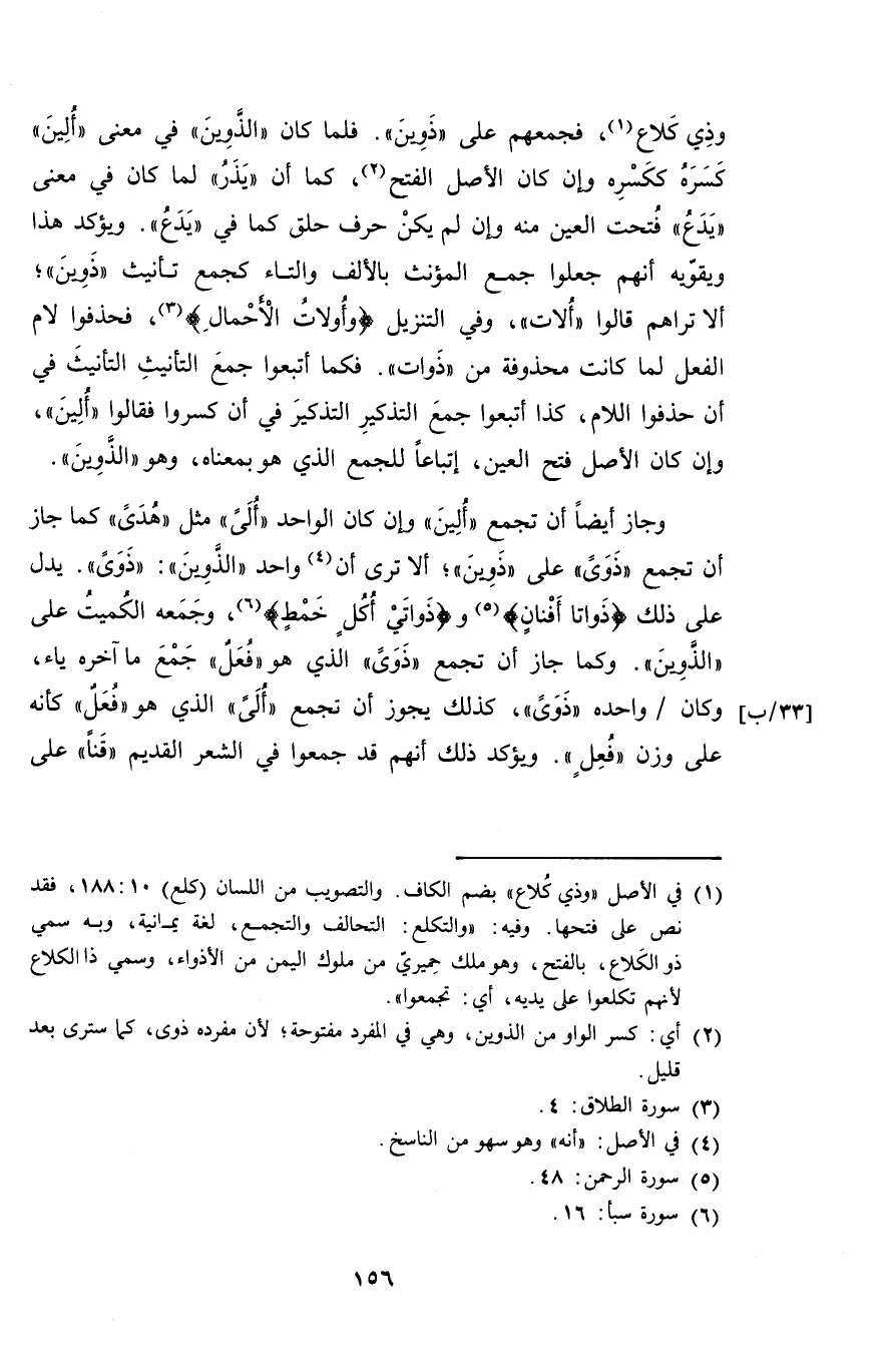 وذي كلاع، فجمعهم على "ذوين". فلما كان "الذوين" في معنى "أُلين" كسره ككسره وإن كان الأصل الفتح، كما أن "يذر" لما كان في معنى "يدع" فتحت العين منه وإن لم يكن حرف حلق كما في "يدع". ويؤكد هذا ويقويه أنهم جعلوا جمع المؤنث بالألف والتاء كجمع تأنيث "ذوين"؛ ألا تراهم قالوا "أُلات"، وفي التنزيل {وأولات الأحمال}، فحذفوا لام الفعل لما كانت محذوفة من "ذوات". فكما أتبعوا جمعوا التأنيث في أن حذفوا اللام، كذا أتبعوا جمع التذكير التذكير في أن كسروا فقالوا "أُلين"، وإن كان الأصل فتح العين، إتباعاً للجمع الذي هو بمعناه، وهو "الذوين".