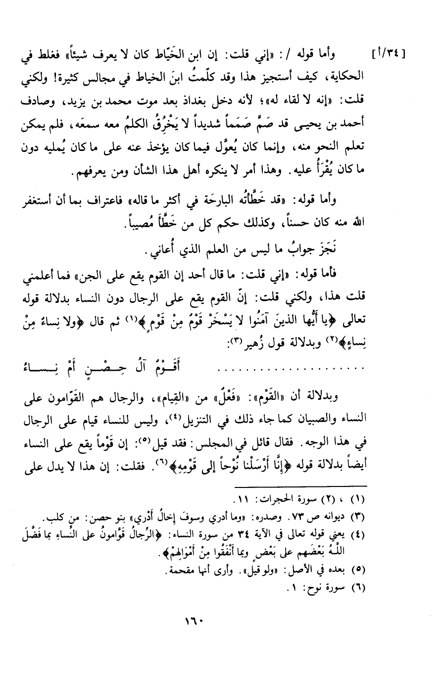 وبدلالة أن "القوم": "فَعْلٌ" من "القيام"، والرجال هم القوامين على النساء والصبيان كما جاء ذلك في التنزيل، وليس للنساء قيام على الرجال في هذا الوجه. فقال قائل في المجلس: فقد قيل: إن قوماً يقع على النساء أيضاً بدلالة قوله {إنا أرسلنا نوحاً إلى قومه}. فقلت: إن هذا لا يدل على