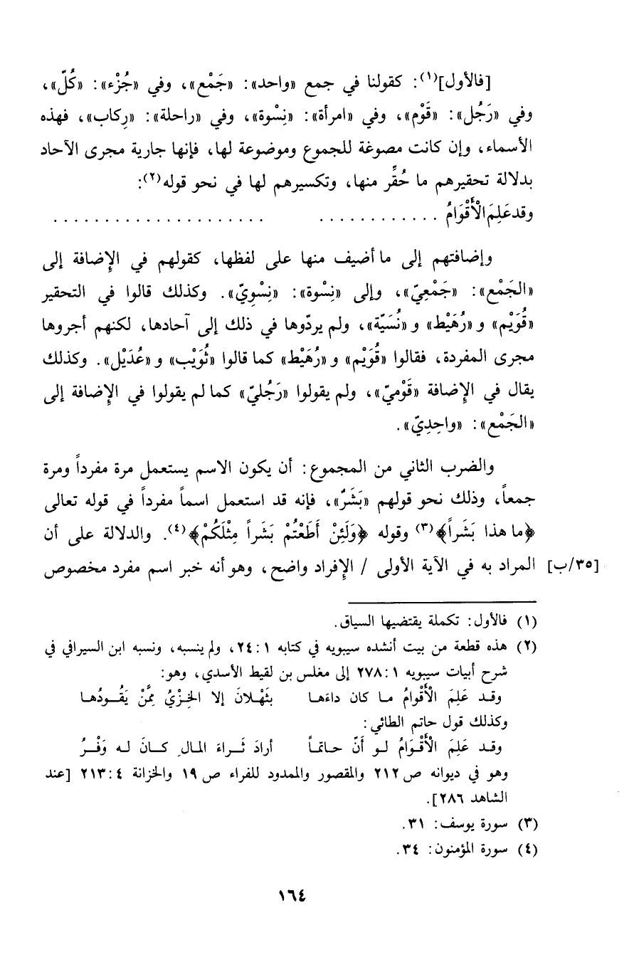 وإضافتهم إلى ما أضيف منها على لفظها، كقولهم في الإضافة إلى "الجمع": "جمعي"، وإلى "نسوة": "نسويّ". كذلك قالوا في التحقير "قويم" و "رهيط" و "نسية"، ولم يردوها في ذلك إلى آحادها، لكنهم أجروها مجرى المفردة، فقالوا "قويم" و "رهيط" كما قالوا "ثويب" و"عديل". وكذلك يقال في الإضافة "قومي"، ولم يقولوا "رجلي" كما لم يقولوا في الإضافة إلى "الجمع": "واحدي".