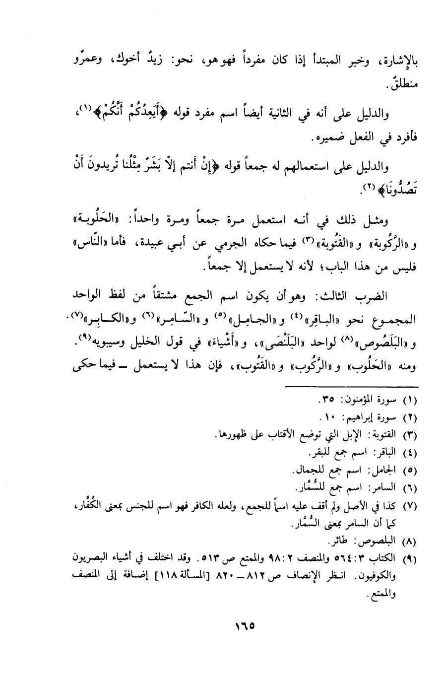 ومثل ذلك في أنه استعمل مرة جمعاً ومرة واحداً: "الحلوبة" و"الركوبة" و"القتوبة" فيما حكاه الجرمي عن أبي عبيدة، فأما "الناس" فليس من هذا الباب؛ لأنه لا يستعمل إلا جميعاً.