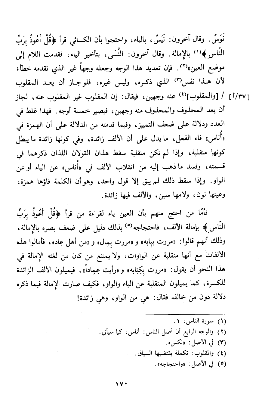 نَوَسٌ. وقال آخرون: نيسٌ، بالياء واحتجوا بأن الكسائي قرأ {قل أعوذ برب الناس} بالإمالة. وقال آخرون: النسى، بتأخير الياء، فقدمت اللام إلى موضع العين". فإن تعديد هذا الوجه وجعله وجهاً غير الذي تقدمه خطأ؛ لأن هذا نفس الذي ذكره، وليس غيره، فلو جاز أن يعد المقلوب [والمقلوب] عنه وجهين، فيقال: إن المقلوب غير المقلوب عنه، لجاز أن يعد المحذوف والمحذوف منه وجهين، فيصير خمسة أوجه. فهذا غلط في العدد ودلالة على ضعف التمييز، وفيما قدمته من الدلالة على أن الهمزة في "أُناس" فاء الفعل، وما يدل على أن الألف زائدة، وفي كونها زائدة ما يبطل كونها منقلبة، وإذا لم تكن منقلبة سقط هذان القولان اللذان ذكرهما في قسمته، وفسد ما ذهب إليه من انقلاب الألف في "أُناس" عن الياء أو عن الواو. وإذا سقط ذلك لم يبق إلا قول واحد، وهو أن الكلمة فاؤها همزة، وعينها نون، ولامها سين، والألف فيها زائدة.