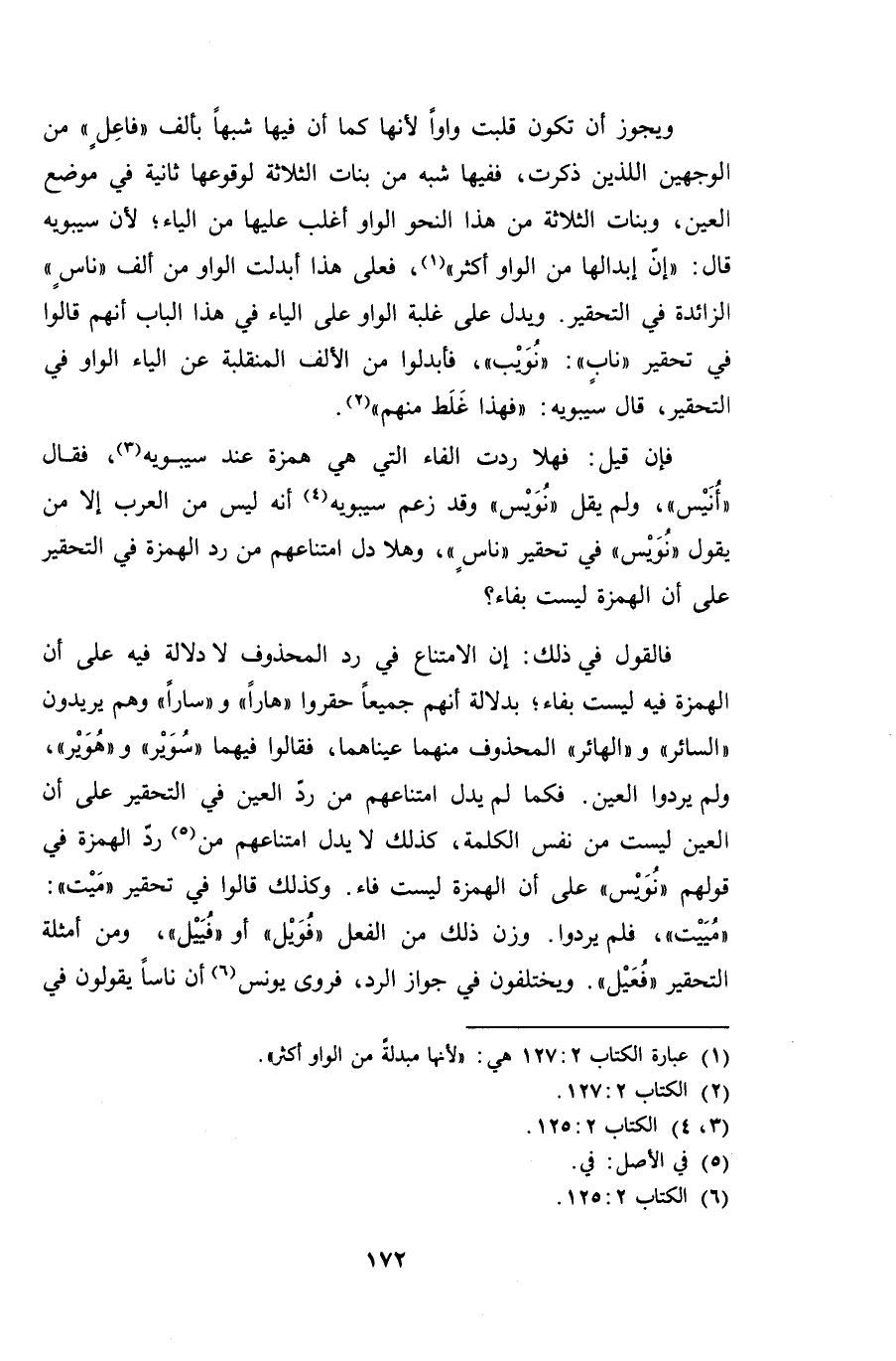 ويجوز أن تكون قلبت واواً لأنها كما أن فيها شبهاً بألف "فاعلٍ" من الوجهين اللذين ذكرت، ففيها شبه من بنات الثلاثة لوقوعها ثانية من موضع العين، وبنات الثلاثة من هذا النحو الواو أغلب عفيها من الياء؛ لأن سيبويه قال: "إن إبدالها من الواو أكثر"، فعلى هذا أبدلت الواو من ألف "ناسٍ" الزائدة في التحقير. ويدل على غلبة الواو على الياء في هذا الباب أنهم قالوا في تحقير "نابٍ": "نويب"، فأبدلوا من الألف المنقلبة عن الياء الواو في التحقير، قال سيبويه: "فهذا غلط منهم".