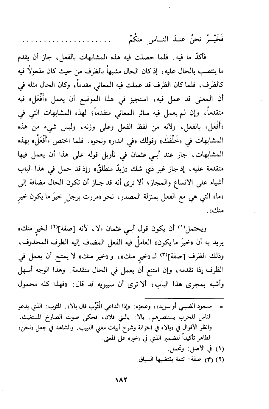 فأكد ما فيه. فلما حصل فيه هذه المشابهات بالفعل، جاز أن يقدم ما ينتصب بالحال عليه، إذ كان الحال مشبهاً بالظرف من حيث كان مفعولاً فيه كالظرف، فلما كان الظرف قد عملت فيه المعاني مقدماً، وكان الحال مثله في أن المعنى قد عمل فيه، استجيز في هذا الموضع أن يعمل "أفعل" فيه متقدماً، وإن لم يعمل فيه سائر المعاني متقدماً؛ لهذه المشابهات التي في "أفعل" بالفعل، ولأنه من لفظ الفعل وعلى وزنه، وليس شيء من هذه المشابهات في "خلفك" وقولك "في الدار" ونحوه. فلما اختص "أفعل" بهذه المشابهات، جاز عند أبي عثمان في تأويل قوله على هذا أن يعمل فيها متقدمة عليه، إذ جاز غير ذي شك "زيدٌ منطلقٌ" وإذ قد حمل في هذا الباب أشياء على الاتساع والمجاز؛ ألا ترى أنه قد جاز أن تكون الحال مضافة إلى "ما" التي هي مع الفعل بمنزلة المصدر، نحو "مررت برجلٍ خير ما يكون خيرٍ منك".