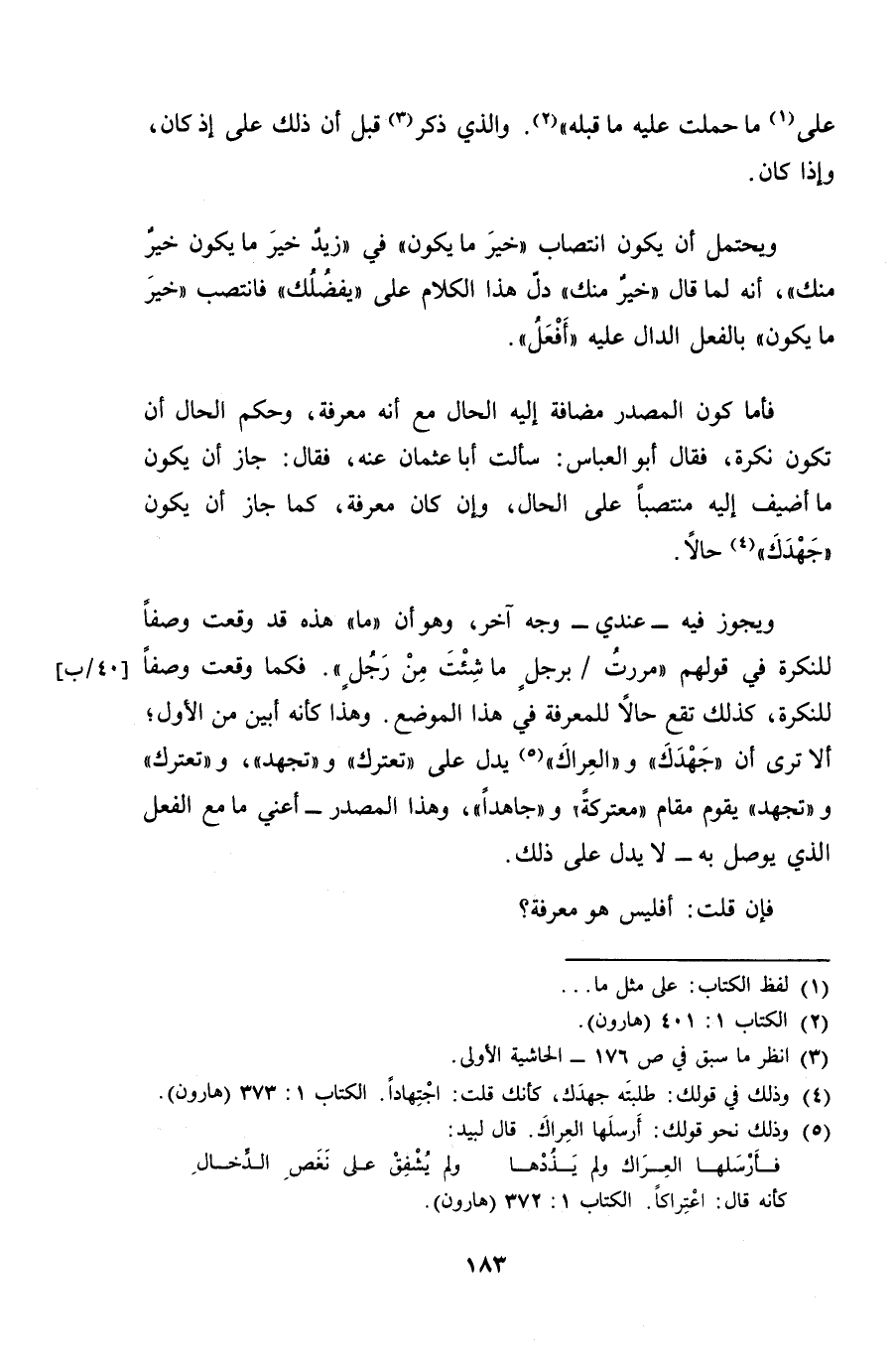 فأما كون المصدر مضافة إليه الحال مع أنه معرفة، وحكم الحال أن تكون نكرة، فقال أبو العباس: سألت أبا عثمان عنه، فقال: جاز أن يكون ما أضيف إليه منتصباً على الحال، وإن كان معرفة، كما جاز أن يكون "جهدك" حالاً.