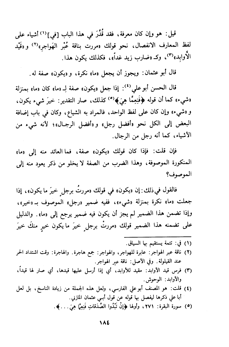فالقول في ذلك: إن "يكون" في قولك "مررت برجلٍ خير ما يكون"، إذا جعلت "ما" نكرة بمنزلة "شيء"، ففيه ضمير "رجل" الموصوف بـ"خير"، وإذا تضمن هذا الضمير لم يجز أن يكون فيه ضمير يرجع إلى "ما". والدليل على تضمنه هذا الضمير قولك "مررت برجلٍ خير ما يكون خيرٍ منك خير