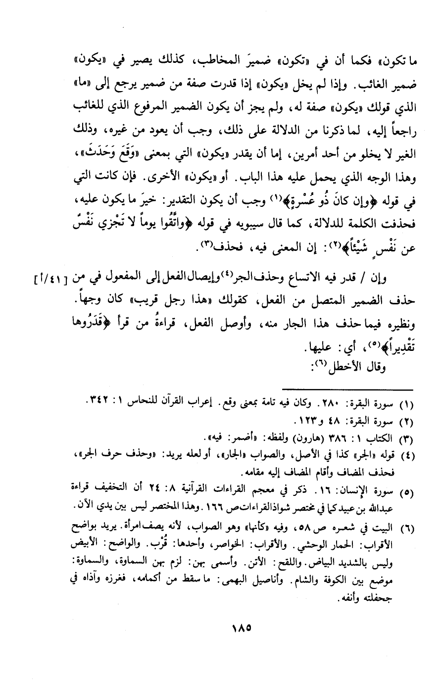 ما تكون" فكما أن في "تكون" ضمير المخاطب، كذلك يصير في "يكون" ضمير الغائب. وإذا لم يخل "يكون" إذا قدرت صفة من ضمير يرجع إلى "ما" الذي قولك "يكون" صفة له، ولم يجز أن يكون الضمير المرفوع الذي للغائب راجعاً إليه، لما ذكرنا من الدلائل على ذلك، وجب أن يعود من غيره، وذلك الغير لا يخلو من أحد أمرين، إما أن يقدر "يكون" التي بمعنى "وقع وحدث"، وهذا الوجه الذي يحمل عليه هذا الباب. أو طيكون" الأخرى. فإن كانت التي في قوله {وإن كان ذو عسرةٍ} وجب أن يكون التقدير: خير ما يكون عليه، فحذفت الكلمة للدلالة، كما قال سيبويه في قوله {واتقوا يوماً لا تجزي نفسٌ عن نفسٍ شيئاً}: إن المعنى فيه، فحذف.