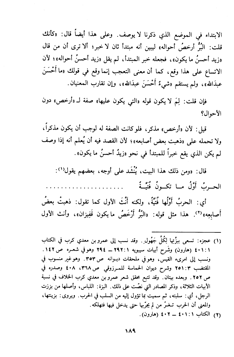 الابتداء في الموضع الذي ذكرنا لا يوصف. وعلى هذا أيضاً قال: "كأنك قلت: البُر أرخص أحواله" ليبين أنه مبتدأ ثان لا خبر؛ ألا ترى أن من قال "زيد أحسن ما يكون"، فجعله خبر المبتدأ، لم يقل "زيد أحسن أحواله"؛ لأن الاتساع على هذا وقع، كما أن معنى التعجب إنما وقع في قولك "ما أحسن عبد الله"، ولم يستقم "شيءٌ أحسن عبد الله"، وإن تقارب المعنيان.