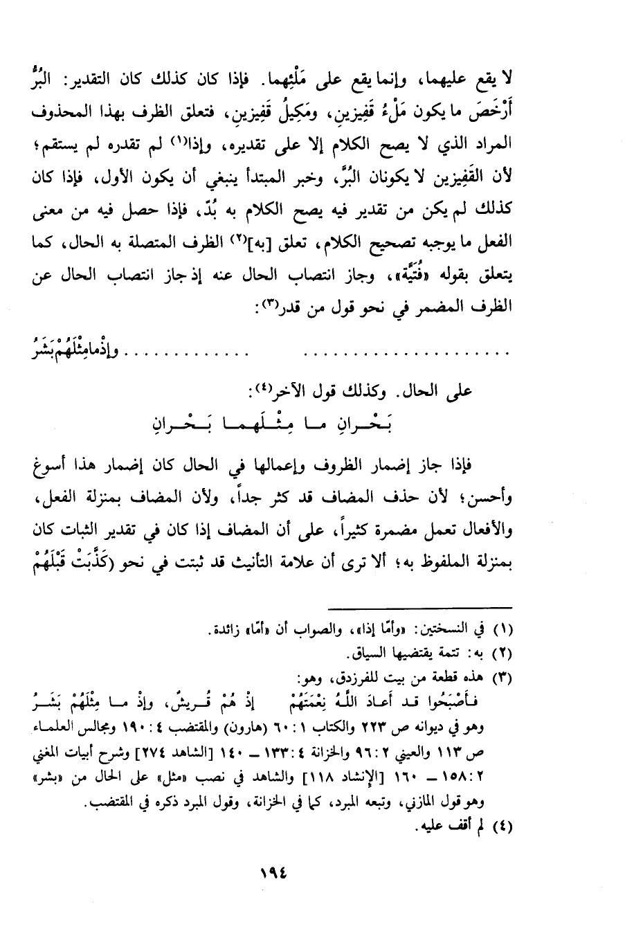 فإذا جاز إضمار الظروف وإعمالها في الحال كان إضمار هذا أسوغ وأحسن؛ لأن حذف المضاف قد كثر جداً، ولأن المضاف بمنزلة الفعل، والأفعال تعمل مضمرة كثيراً، وعلى أن المضاف إذا كان في تقدير الثبات كان بمنزلة الملفوظ به؛ ألا ترى أن علامة التأنيث قد ثبتت في نحو (كذّبت قبلهم