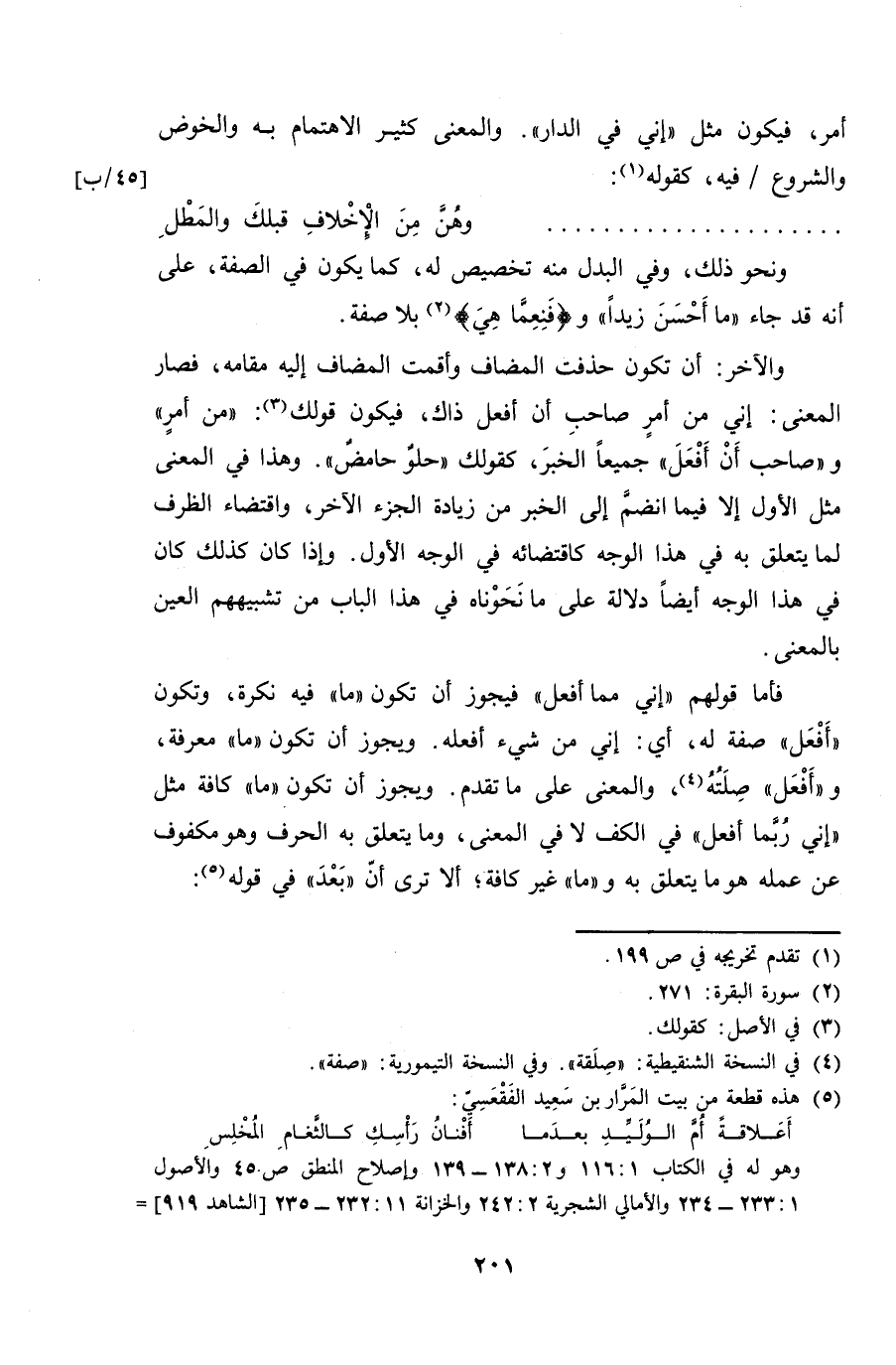 والآخر: أن تكون حذفت المضاف وأقمت المضاف إليه مقامه، فصار المعنى: إني من أمرٍ صاحبِ أن أفعل ذاك، فيكون قولك: "من أمرٍ" و "صاحب أنْ أَفْعَلَ" جميعاً الخبر، كقولك "حلوٌ حامضٌ". وهذا في المعنى مثل الأول إلا فيما انضم إلى الخبر من زيادة الجزء الآخر، واقتضاء الظرف لما يتعلق به في هذا الوجه كاقتضائه في الوجه الأول. وإذا كان كذلك كان في هذا الوجه أيضاً دلالة على ما نحوناه في هذا الباب من تشبيههم العين بالمعنى.
