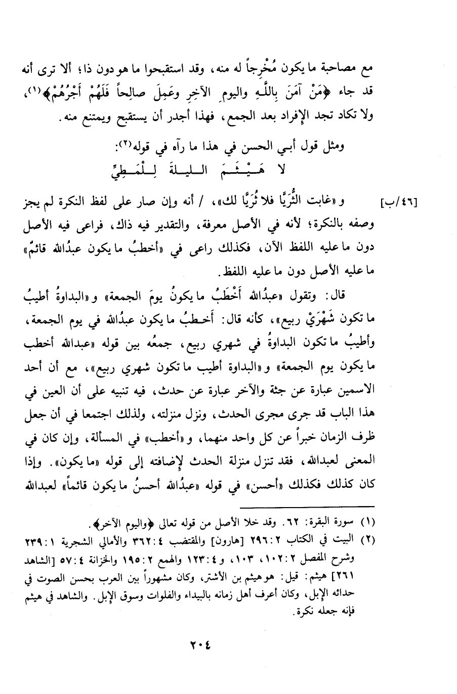 قال: وتقول "عبد الله أخطب ما يكون يوم الجمعة" و "البداوة أطيب ما تكون البداوة في شهري ربيع، جمعُه بين قوله "عبد اله أخطب ما يكون يوم الجمعة" و "البداوة أطيب ما تكون شهري ربيع"، مع أن أحد الأسمين عبارة عن جثة والآخر عبارة عن حدث، فيه تنبيه على أن العين في هذا الباب قد جرى مجرى الحدث، ونزل منزلته، ولذلك اجتمعا في أن جعل ظرف الزمان خبراً عن كل واحد منهما، و "أخطب" في المسألة، وإن كان في المعنى لعبد الله، فقد تنزل منزلة الحدث لإضافته إلى قوله "ما يكون". وإذا كان كذلك فكذلك "أحسن" في قوله "عبد الله أحسن ما يكون قائماً" لعبد الله