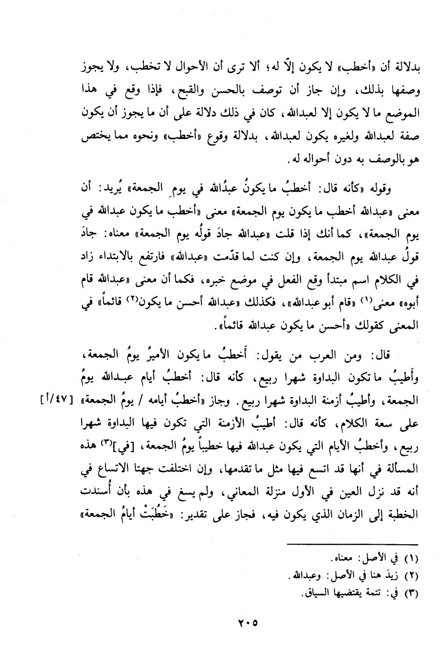 قال: ومن العرب من يقول: أخطبُ ما يكون الأمير يوم الجمعة، وأطيب ما تكون البداوة شهرا ربيع، كأنه قال: أخطب أيام عبد الله يوم الجمعة، وأطيب أزمنة البداوة شهرا ربيع. وجاز "أخطب أيامه/ يوم الجمعة" على سعة الكلام، كأنه قال: أطيبُ الأزمنة التي تكون فيها البداوة شهرا ربيع، وأخطب الأيام التي يكون عبد الله فيها خطيباً يوم الجمعة، [في] هذه المسألة في أنها قد اتسع فيها مثل ما تقدمها، وإن اختلفت جهتا الاتساع في أنه قد نزل العين في الأول منزلة المعاني، ولم يسغ في هذه بأن أُسندت الخطبة إلى الزمان الذي يكون فيه، فجاز على تقدير: "خطُبَت أيام الجمعة"