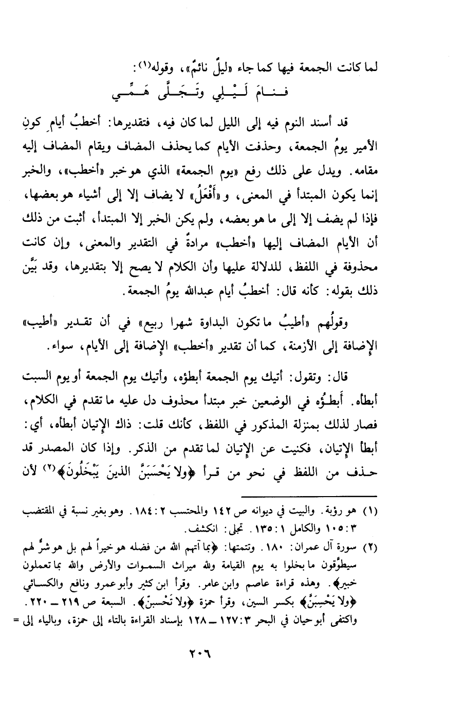 قد أسند النوم فيه إلى الليل لما كان فيه، فتقديرها: أخطبُ أيامِ كون الأمير يوم الجمعة، وحذفت الأيام كما يحذف المضاف ويقام المضاف إليه مقامه. ويدل على ذلك رفع "يوم الجمعة" الذي هو خبر "أخطب"، والخبر إنما يكون المبتدأ في المعنى، و "أَفْعَلُ" لا يضاف إلا إلى أشياء هو بعضها، فإذا لم يضف إلا إلى ما هو بعضه، ولم يكن الخبر إلا المبتدأ، أثبت من ذلك أن الأيام المضاف إليها "أخطب" مرادةٌ في التقدير والمعنى، وإن كانت محذوفة في اللفظ، للدلالة عليها وأن الكلام لا يصح إلا بتقديرها، وقد بيَّن ذلك بقوله: كأنه قال: أخطبُ أيام عبد الله يومُ الجمعة.