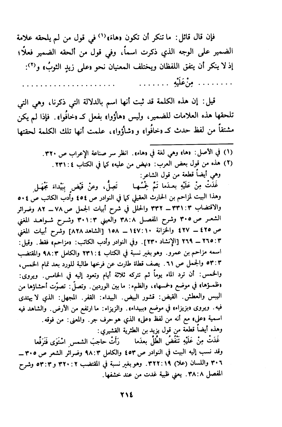 فإن قال قائل: ما تنكر أن تكون "هاء" في قول من لم يلحقه علامة الضمير على الوجه الذي ذكرت اسماً، وفي قول من ألحقه الضمير فعلاً؛ إذ لا ينكر أن يتفق اللفظان ويختلف المعنيان نحو "على زيدٍ الثوبُ" و: