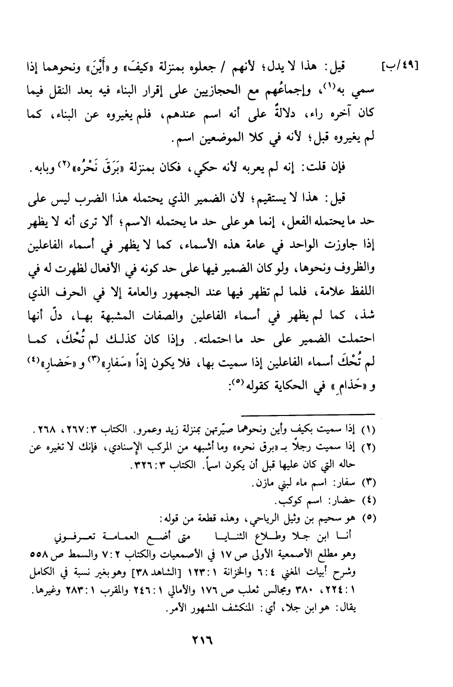 قيل: هذا لا يستقيم؛ لأن الضمير الذي يحتمله هذا الضرب ليس على حد ما يحتمله الفعل، إنما هو على حد ما يحتمله الاسم؛ ألا ترى أنه لا يظهر إذا جاوزت الواحد في عامة هذه الأسماء، كما لا يظهر في أسماء الفاعلن والظروف ونحوها، ولو كان الضمير فيها على حد كونه في الأفعال لظهرت له في اللفظ علامة، فلما لم تظهر فيها عند الجمهور والعامة إلا في الحرف الذي شذ، كما لم يظهر في أسماء الفاعلين والصفات المشبهة بها، دلّ أنها احتملت الضمير على حد ما احتملته. وإذا كان كذلك لم تُحْكَ، كما لم تُحْكَ أسماء الفاعلين إذا سميت بها، فلا يكون إذاً "سَفارِ" و "حَضارِ" و "حَذامِ" في الحكاية كقوله: