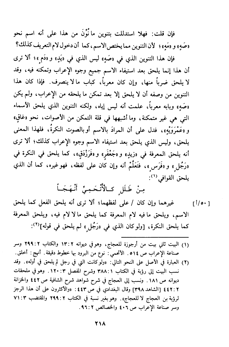 فإن هذا التنوين الذي في "صهٍ" ليس الذي في "يدٍ" و "دمٍ"؛ ألا ترى أن هذا إنما يلحق بعد استيفاء الاسم جميع وجوه الإعراب وتمكنه فيه، وقد لا يلحق ضرباً منها، وإن كان معرباً، كباب ما لا ينصرف. فإذا كان هذا التنوين من وصفه أن لا يلحقه إلا بعد تمكن ما يلحقه من الإعراب، ولم يكن "صهٍ" وبابه معرباً، علمت أنه ليس إياه، ولكنه التنوين الذي يلحق الأسماء التي هي غير متمكنة، وما أشبهها في قلة التمكن من الأصوات، نحو "غاقٍ" و "عمرويهٍ"، فدل على أن المراد بالاسم أو بالصوت النكرةُ، فلهذا المعنى يلحق، وليس الذي يلحق بعد استيفاء الاسم وجوه الإعراب كذلك؛ ألا ترى أنه يلحق المعرفة في "زيدٍ" و "جعفرٍ" و "فرزدقٍ"، كما يلحق في النكرة في "رجُلٍ" و "فرسٍ"، فتعلَّم أنه وإن كان على لفظه، فهو غيره، كما أن الذي يلحق القوافي: