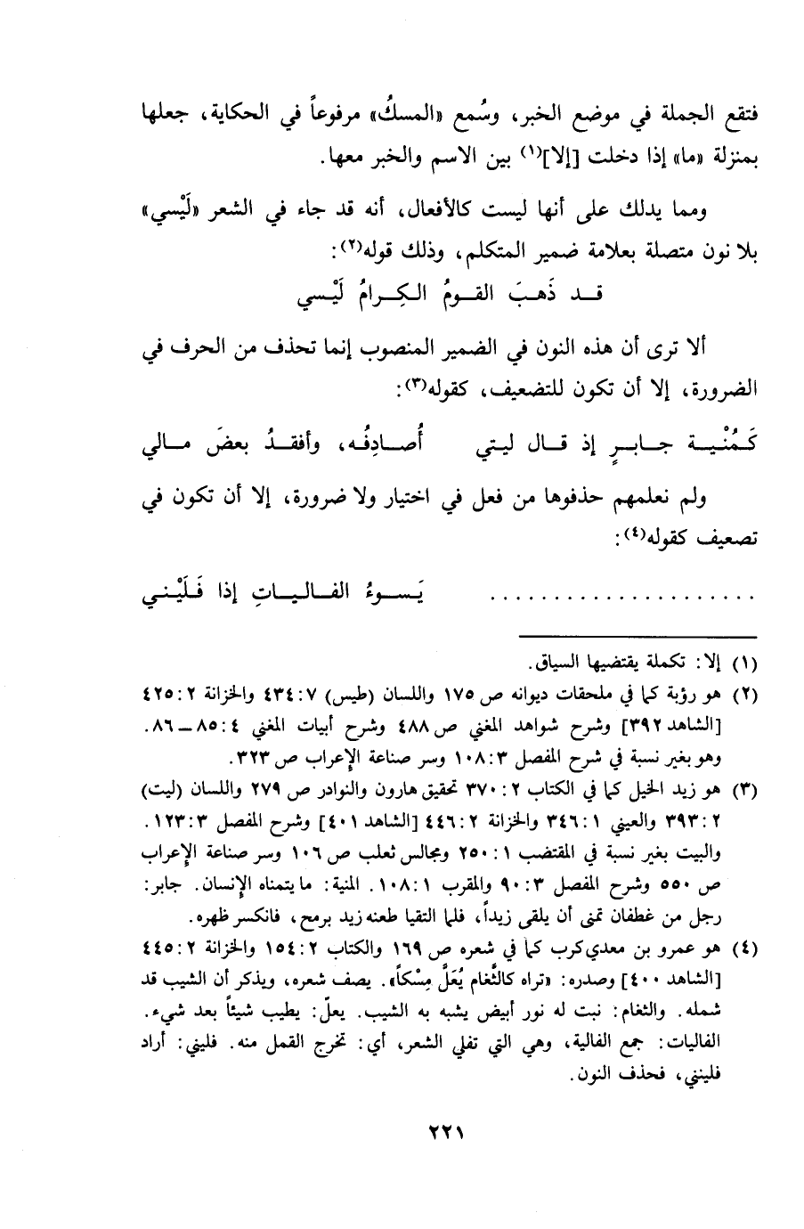 ومما يدلك على أنها ليست كالأفعال، أنه قد جاء في الشعر "ليسي" بلا نون متصلة بعلامة ضمير المتكلم، وذلك قوله: