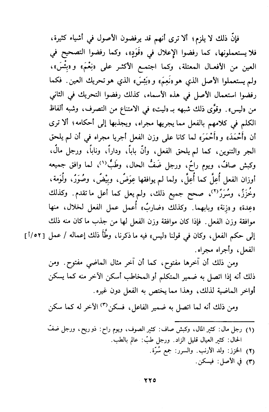 فإن ذلك لا يلزم؛ أنهم قد يرفضون الأصول في أشياء كثيرة، فلا يستعملونها، كما رفضوا الإعلال في "قودٍ"، وكما رفضوا التصحيح في العين من الأفعال المعتلة، وكما اجتمع الأكثر على "نِعْمَ" و "بِئْسَ"، ولم يستعملوا الأصل الذي هو "نَعِمَ" و "بَئِسَ" الذي هو تحريك العين. فكما رفضوا استعمال الأصل في هذه الأسماء، كذلك رفضوا التحريك في الثاني من "ليس". وقوى ذلك شبهه بـ "ليت" في الامتناع من التصرف، وشبه ألفاظ الكلم في كلمهم بالفعل مما يجريها مجراه، ويجذبها إلى أحكامه؛ ألا ترى أن "أحمد" و "أحمر" لما كانا على وزن الفعل أجريا مجراه في أن لم يلحق الجر والتنوين، كما لم يلحق الفعل، وأن باباً، وداراً، وناباً، ورجل مالٌ، وكبش صافٌ، ويوم راحٌ، ورجل ضفُّ الحال، وطبٌ، لما وافق جميعه أوزان الفعل أُعِلَّ كما أُعِلَّ، ولما لم يوافقها عِوضٌ، وبيضٌ، وصُورٌ، ولُومة، وخُزرٌ، وسُررٌ، صحح جميع ذلك، ولم يعل كما أعل ما تقدم. وكذلك "عِدة" و "زِنة" وبابهما. وكذلك "ضاربٌ" أُعمل عمل الفعل لخلال، منها موافقة وزن الفعل. فإذا كان موافقة وزن الفعل لها من جذب ما كان منه ذلك إلى حكم الفعل، وكان في قولنا "ليس" فيه ما ذكرنا، وطأ ذلك إعماله/ عمل الفعل، وأجراه مجراه.