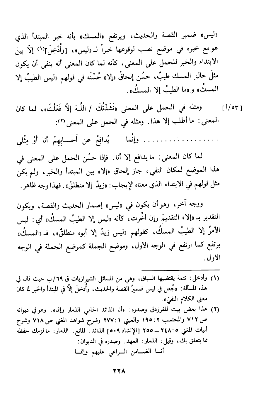 ووجه آخر، وهو أن يكون في "ليس" إضمار الحديث والقصة، ويكون التقدير بـ "إلا" التقديم وإن أخرت، كأنه "ليس إلا الطيبُ المسكُ" أي: ليس الأمرُ إلا الطيبُ المسكُ، كقولهم "ليس زيدٌ إلا أبوه منطلقٌ"، فـ "المسكُ" يرتفع كما ارتفع في الوجه الأول، وموضع الجملة كموضع الجملة في الوجه الأول.