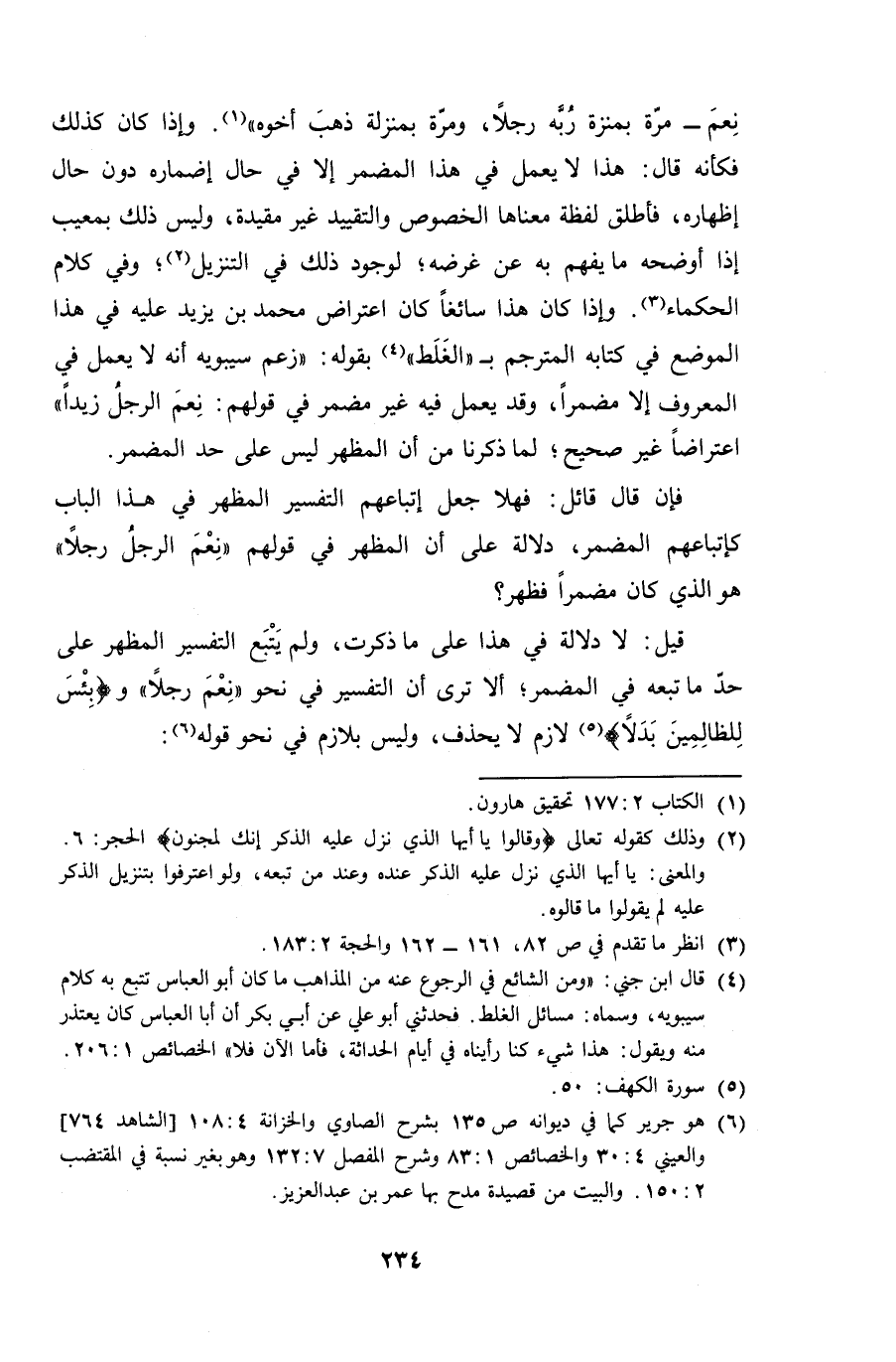 نِعَم- مرة بمنزة رُبه رجلاً، ومرة بمنزلة ذهب أخوه". وإذا كان كذلك فكأنه قال: هذا لا يعمل في هذا المضمر إلا في حال إضماره دون حال إظهاره، فأطلق لفظة معناها الخصوص والتقييد غير مقيدة، وليس ذلك بمعيب إذا أوضحه ما يفهم به عن غرضه؛ لوجود ذلك في التنزيل؛ وفي كلام الحكماء. وإذا كان هذا سائغاً كان اعتراض محمد بن يزيد عليه في هذا الموضع في كتابه المترجم بـ "الغلط" بقوله: "زعم سيبويه أنه لا يعملفي المعروف إلا مضمراً، وقد يعمل فيه غير مضمر في قولهم: نِعمَ الرجلُ زيداً" اعتراضاً غير صحيح؛ لما ذكرنا من أن المظهر ليس على حد المضمر.