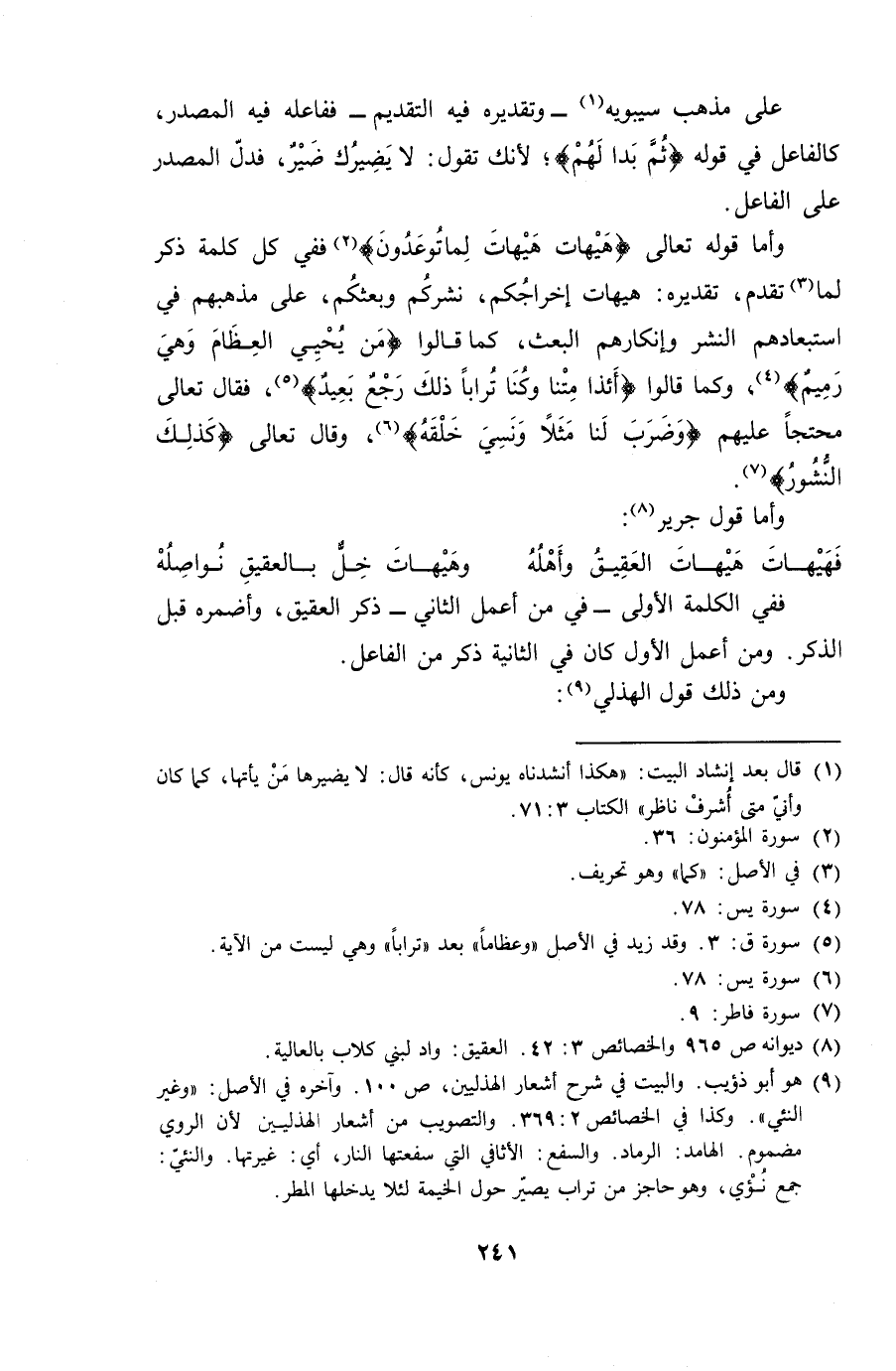 وأما قوله تعالى {هيهات هيهات لما توعدون} ففي كل كلمة ذكر لما تقدم، تقديره: هيهات إخراجُكم، نشركُم وبعثكُم، على مذهبهم في استبعادهم النشر وإنكارهم البعث، كما قالوا {من يحيى العظام وهي رميم}، وكما قالوا {أئذا متنا وكنا تراباً ذلك رجعٌ بعيدٌ}، فقال تعالى محتجاً عليهم {وضرب لنا مثلاً ونسي خلقه}، وقال تعالى {كذلك النشور}.