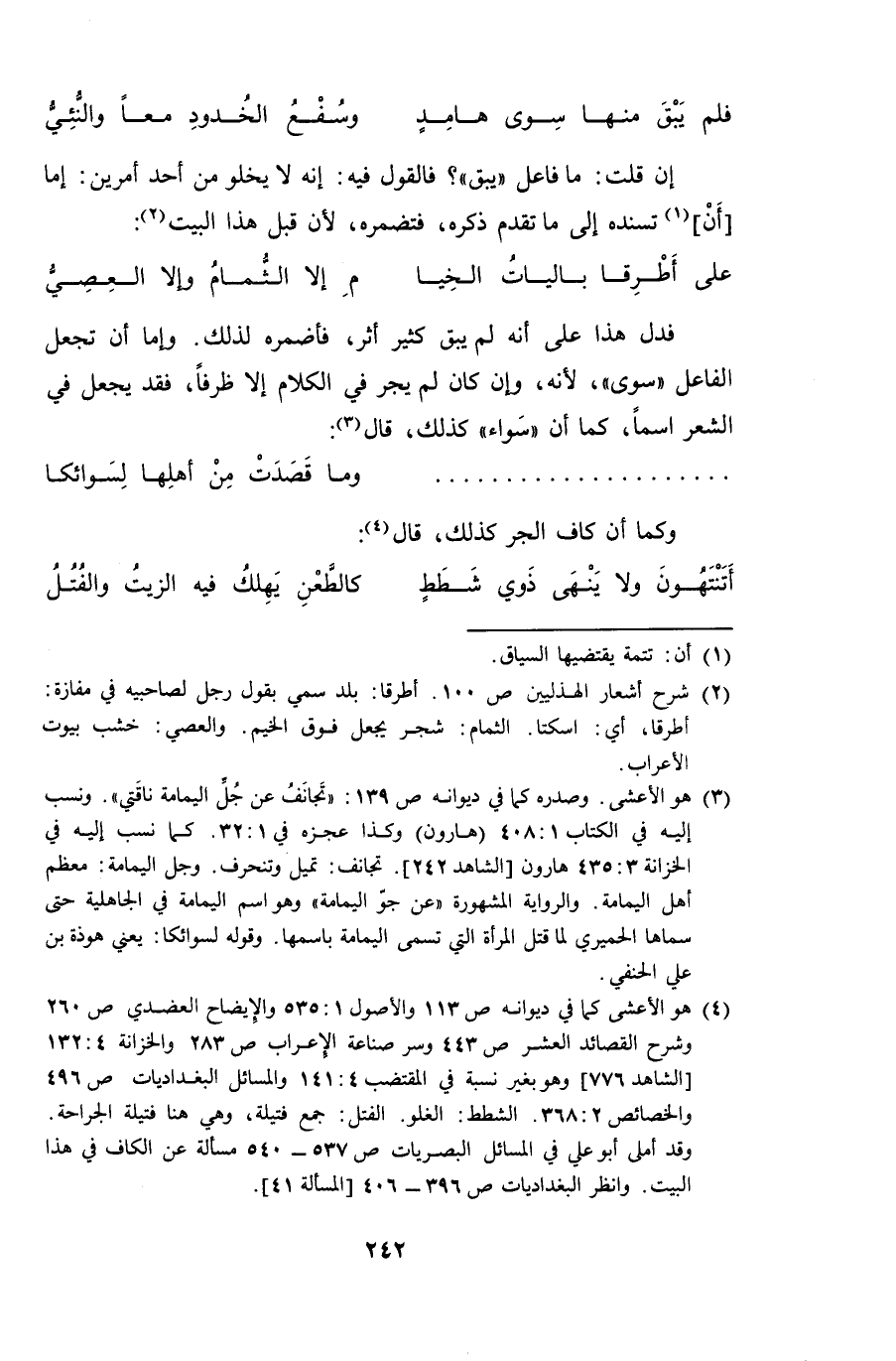 فدل هذا على أنه لم يبق كثير أثر، فأضمره لذلك. وإما أن تجعل الفاعل "سوى"، لأنه، وإن كان لم يجر في الكلام إلا ظرفاً، فقد يجعل في الشعر اسماً، كما أن "سواء" كذلك، قال: