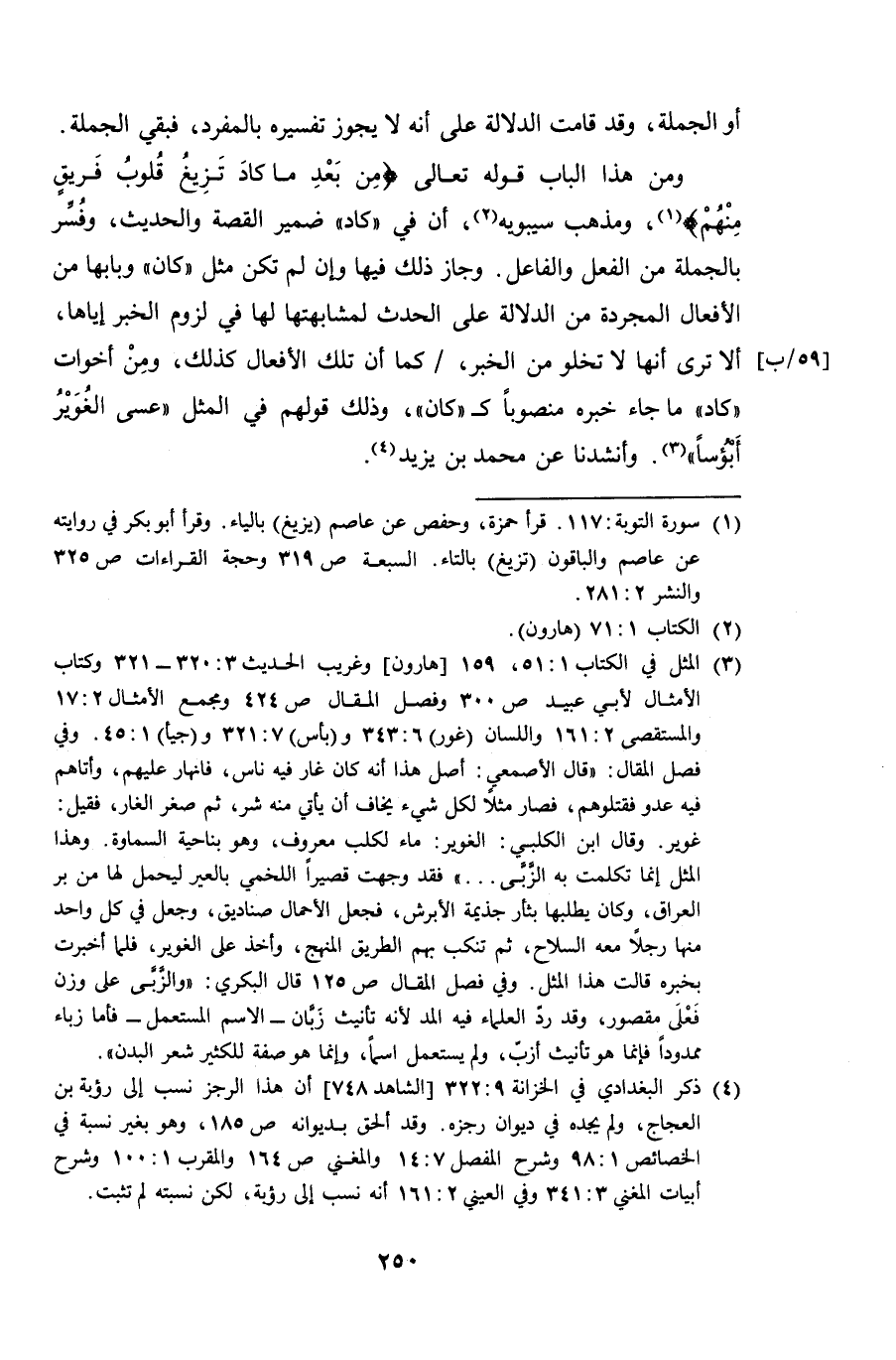 ومن هذا الباب قوله تعالى {من بعد ما كاد تزيغ قلوب فريقٍ منهم}، ومذهب سيبويه، أن في "كاد" ضمير القصة والحديث، وفُسر بالجملة من الفعل والفاعل. وجاز ذلك فيها وإن لم تكن مثل "كان" وبابها من الأفعال المجردة من الدلالة على الحدث لمشابهتها لها في لزوم الخبر إياها، ألا ترى أنها لا تخلو من الخبر، كما أن تلك الأفعال كذلك، ومِنْ أخوات "كاد" ما جاء خبره منصوباً كـ "كان"، وذلك قولهم في المثل "عسى الغُوير أبؤساً". وأنشدنا عن محمد بن يزيد.